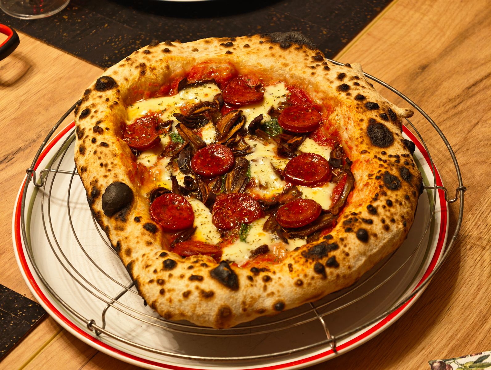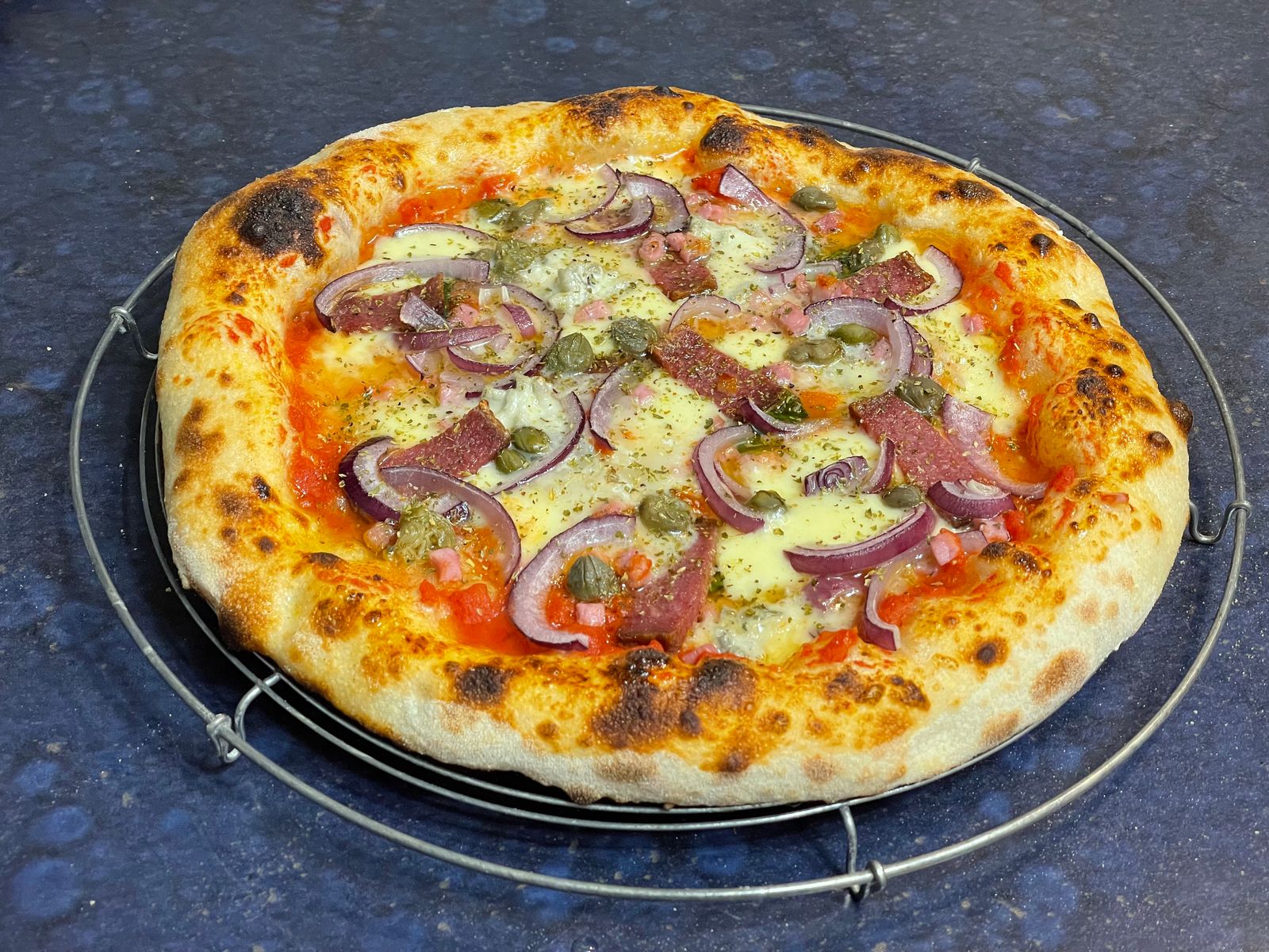 Pizza Rumfort: Salami, Speck, Gorgonzola, Kapern, Zwiebeln & Oregano
