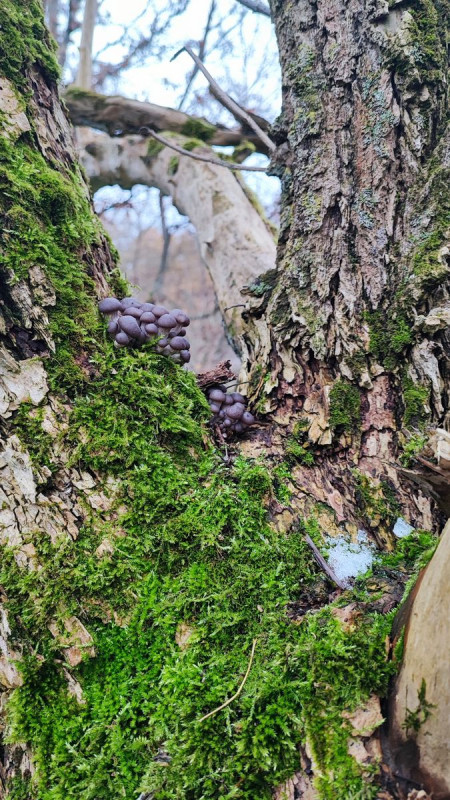 junge Violette Pilze an Holunder im Winter