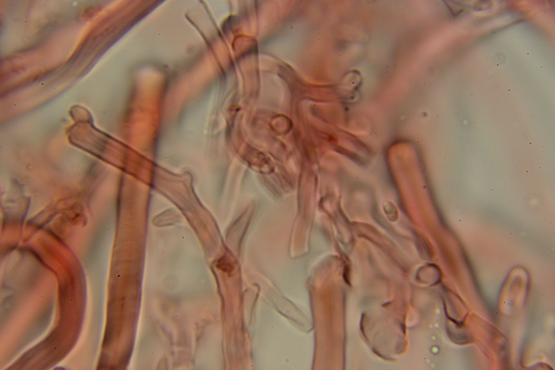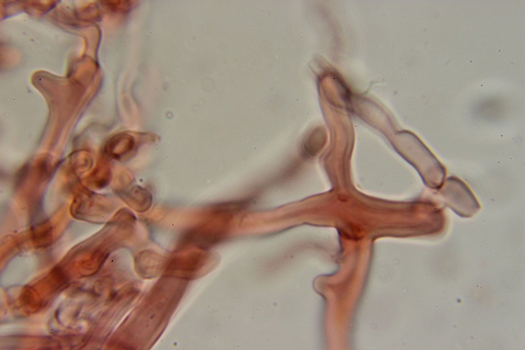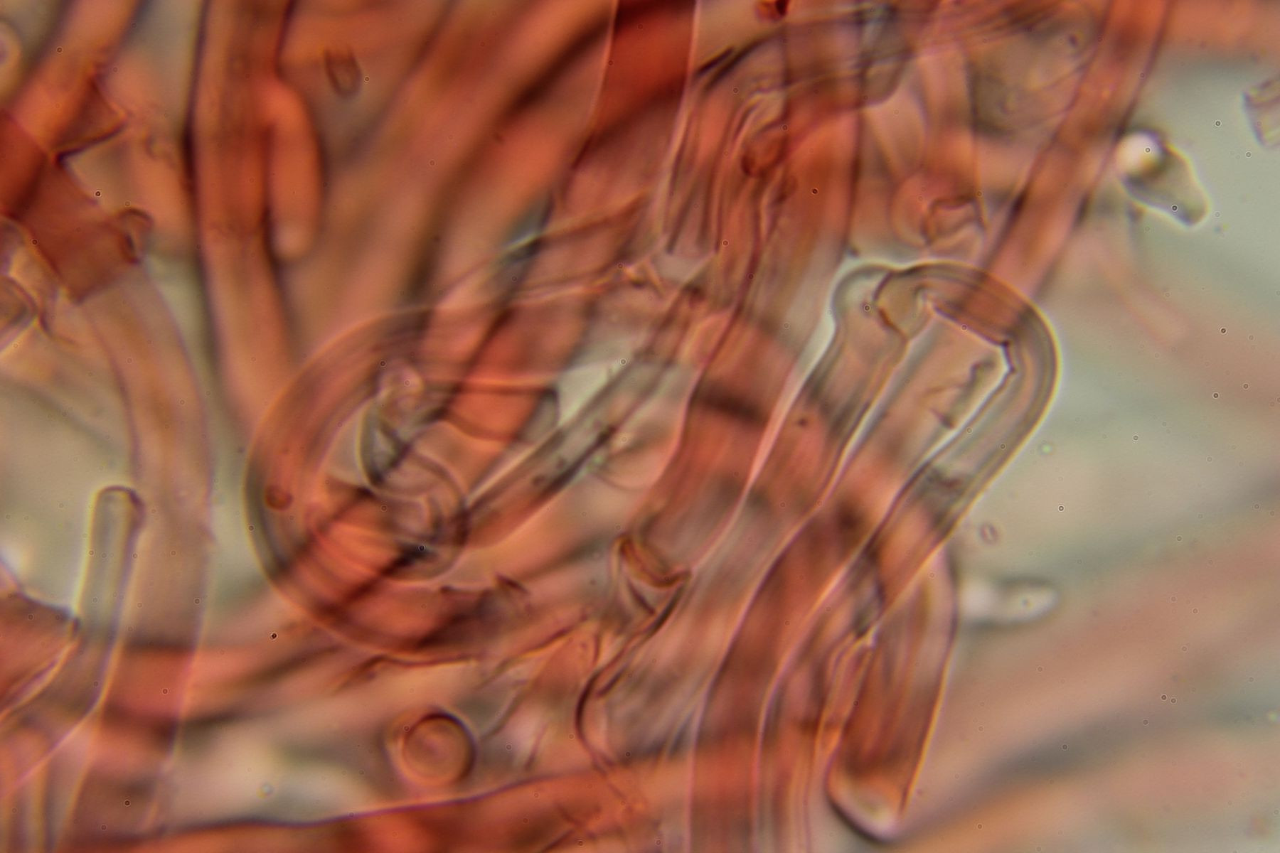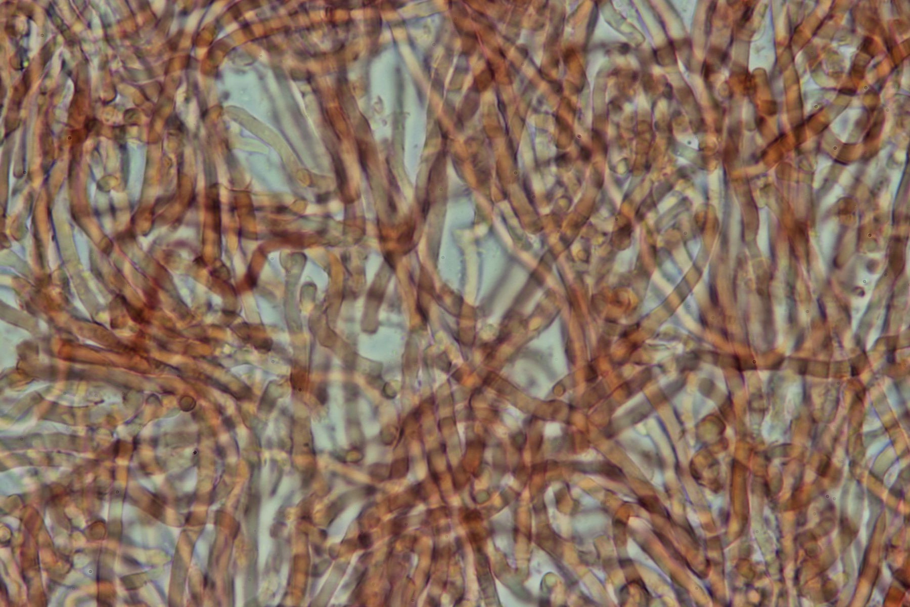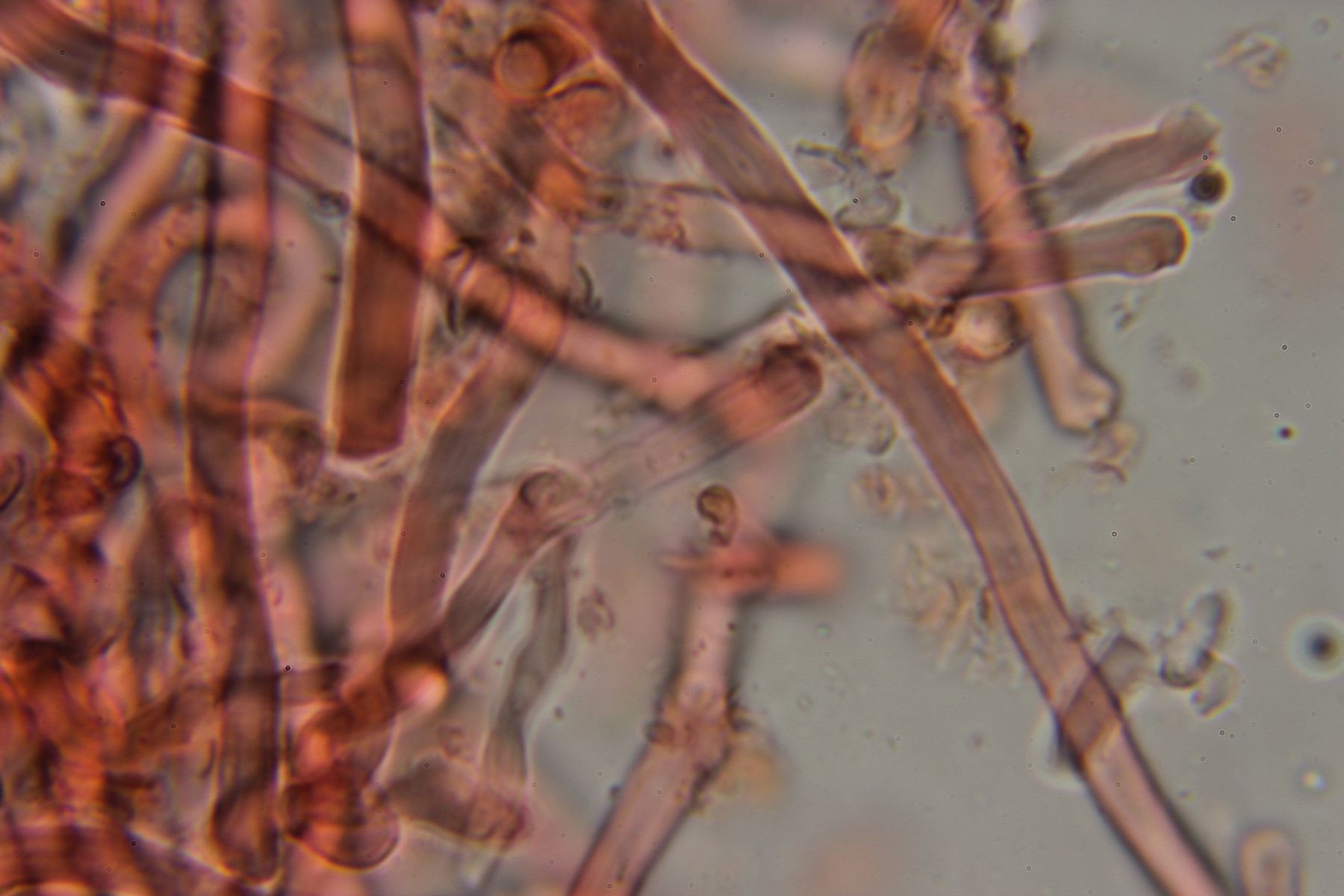 Das Hymenium ist M.m nach monomitisch und besteht aus dunn bis dickwandige generative Hyphen mit schnallen, grösstenteil aber aus langgezogenen sclerifizierten Hyphen, als Skeletthyphen würde ich sie aber nicht bezeichnen