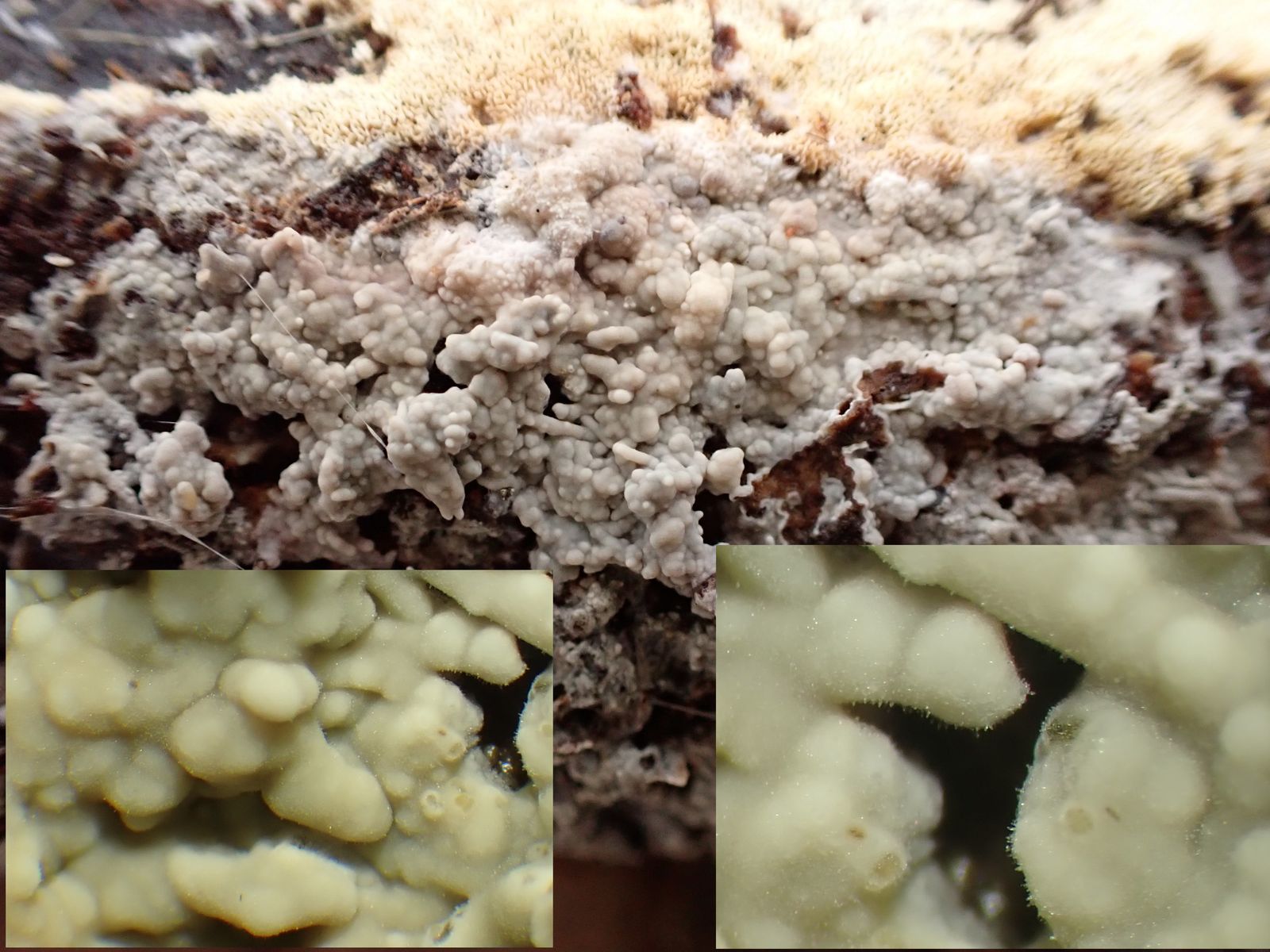 Hallo nochmal hier wieder ein Fund vom Wochenende, eine Hyphoderma mit Dendrohyphidia, Corticiaceae von Bernicchia ist die einzige Art H. malenconii die Dendrohyphidia ausbildet, da passen aber die Sporen nicht dazu. Ich denke das es sich nur um Hyphoderma nemorale handelt.