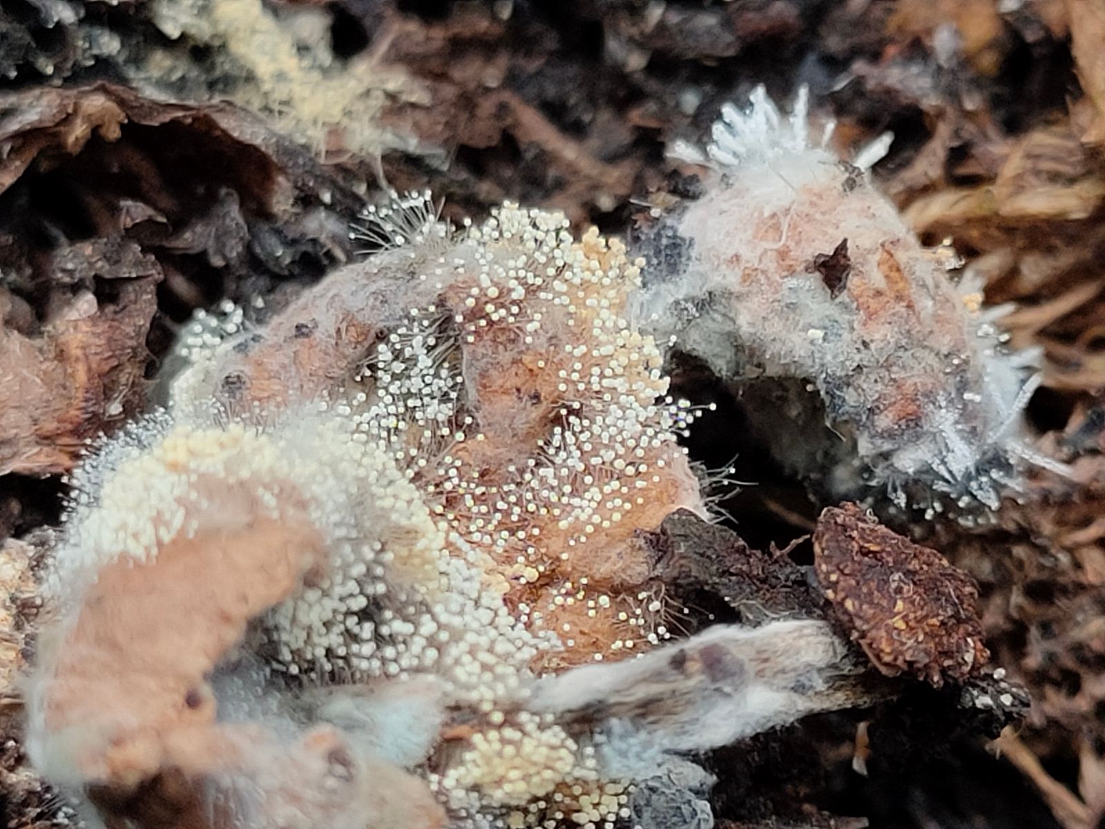 Der Wirt/Myxo wächst auf kleinen Pilz- oder Pflanzenresten und die/der Polycephalomyces wiederum auf dem Asco. Den Wirt kann ich nicht bestimmen.
