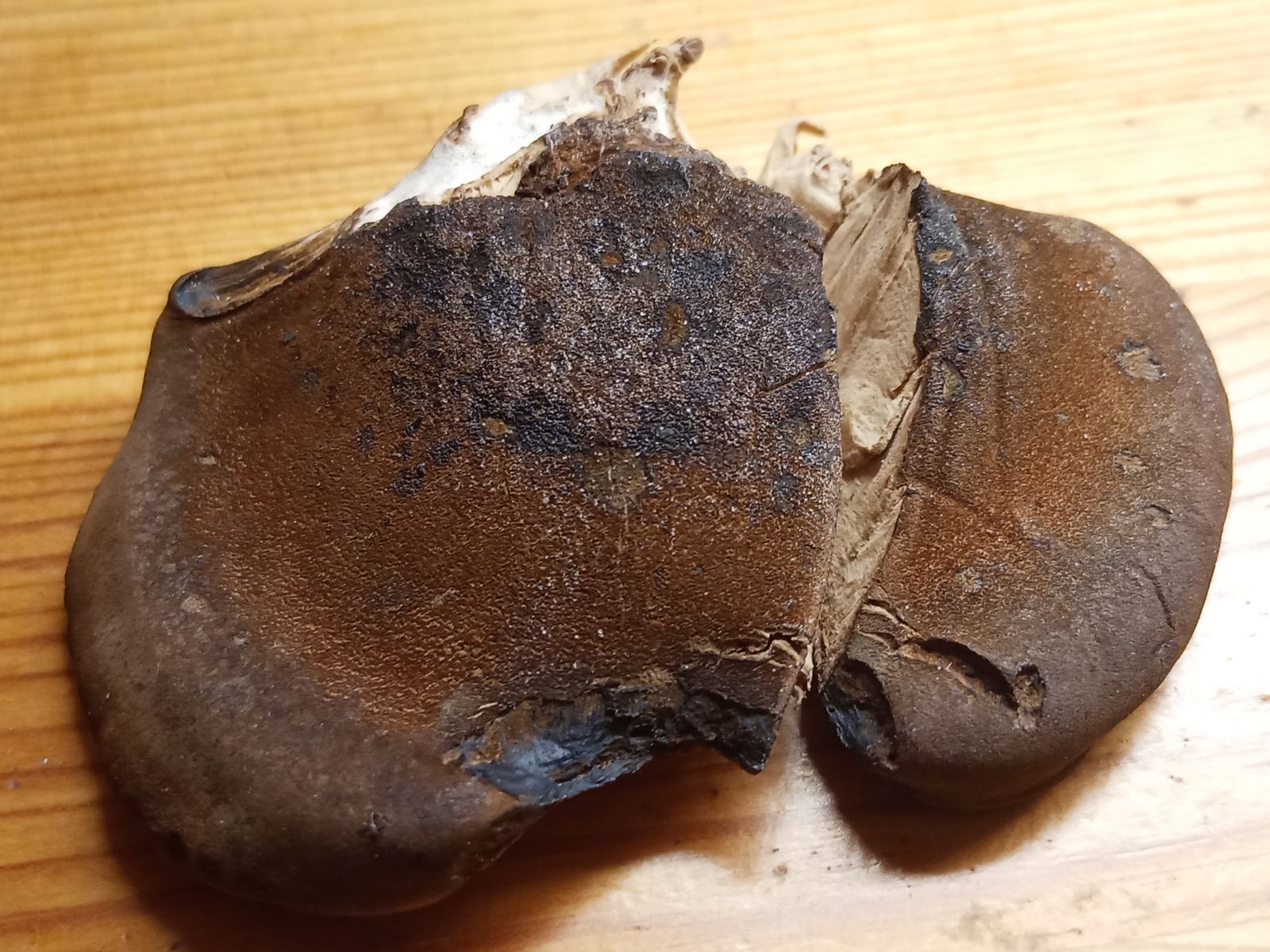 Der Laubholzharzporling ist nicht mehr so selten bei uns. Den habe ich eigentlich ausgeschlossen. Es passt einiges, aber so ein gleichmäßiges Braun auf der Hutoberseite kenne ich nicht. Der Geruch kann ja verloren sein, weil der Pilz eigentlich trocken ist. Es wäre dann auch ein toller Fund. An Birke, Buche und jetzt Kirsche.