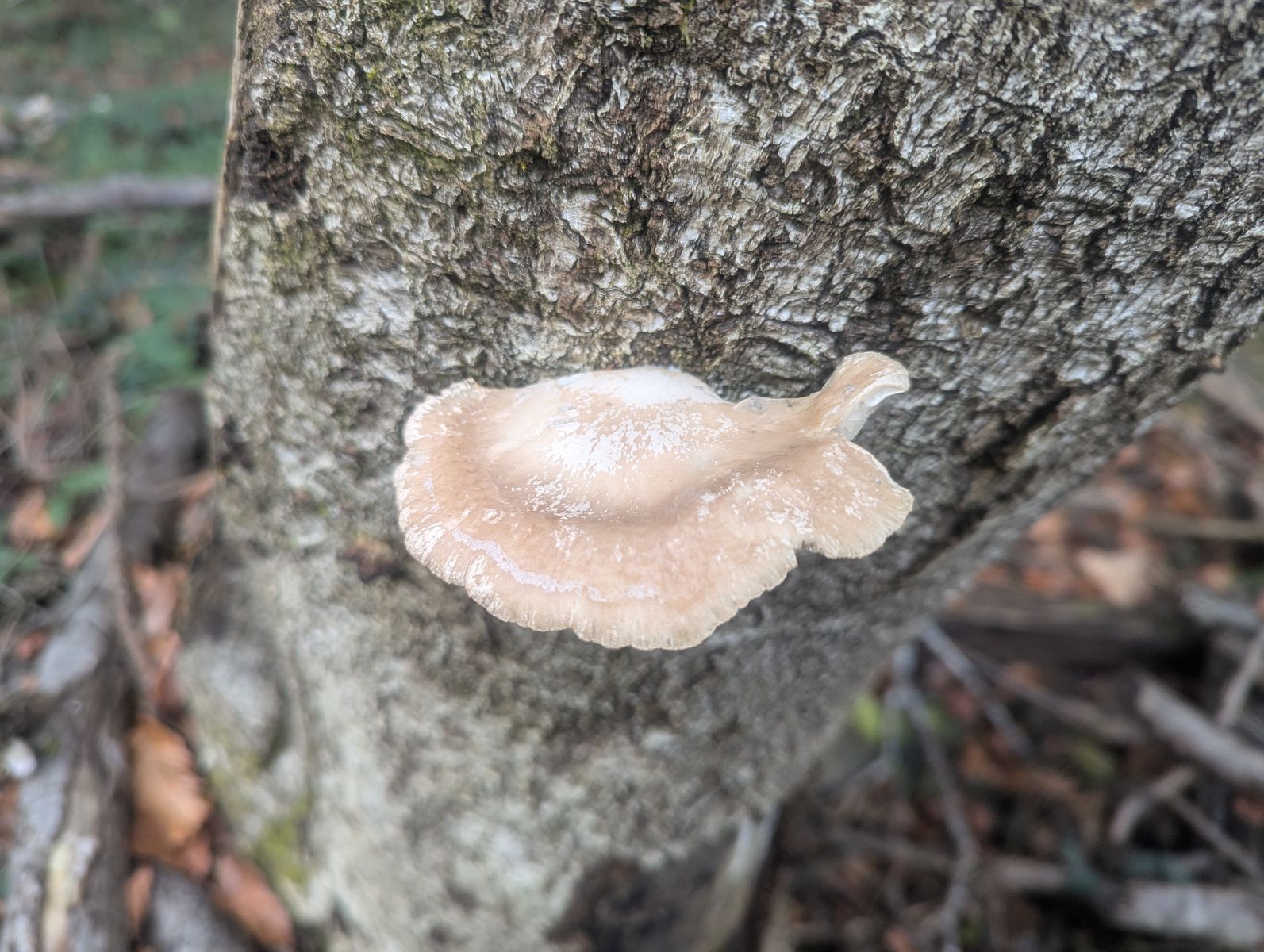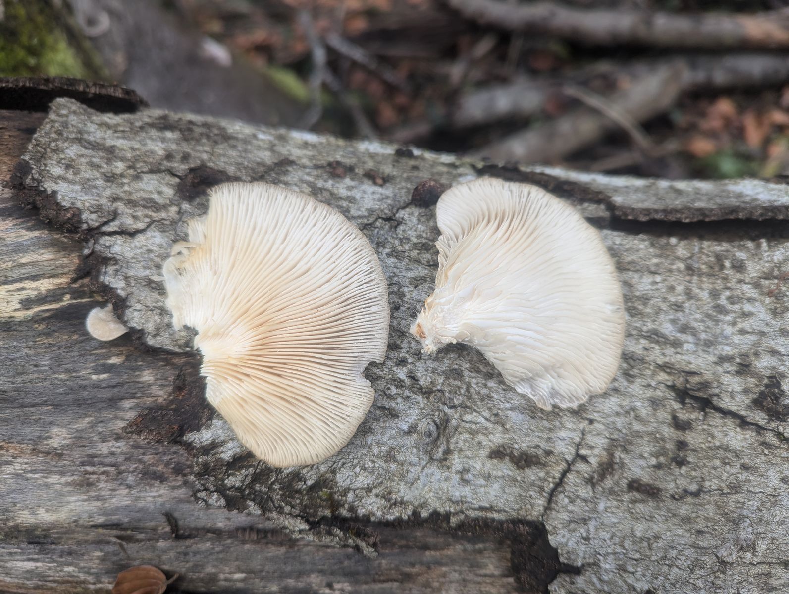 Berindeter Seitling, Lungenseitling, Ohrförmiger Seitling ... es gibt sicher ein paar mit denen man die Auster verwechseln kann. Geh mal auf 123 Pilzsuche und such den Austernseitling und schau Dir dort etwaige Verwechslungspartner an und dann wieder Verwechslungspartner der Verwechslungspartner und Du wirst sehen, gerade weil deine FKs so ausgeblichen sind, ist das durchaus gar nicht mehr sooo einfach sich 100% festzulegen.
