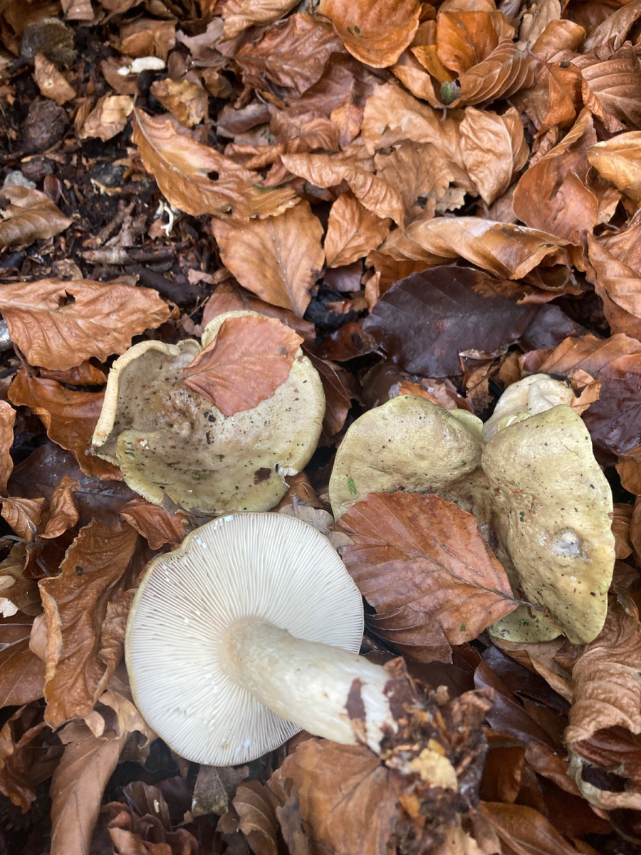 B: graugrüner Milchling ( weiße scharfe Milch, klebriger Hut, hohler Stiel, unter Rotbuche )?