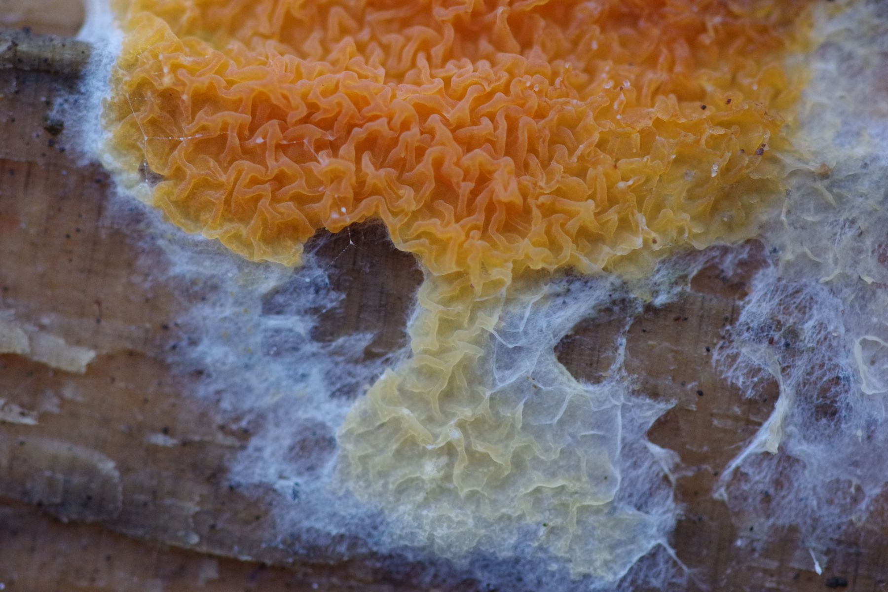auf Kiefernscheiten, die seit einiger Zeit draußen liegen, wächst ein grelloranger Fältling.