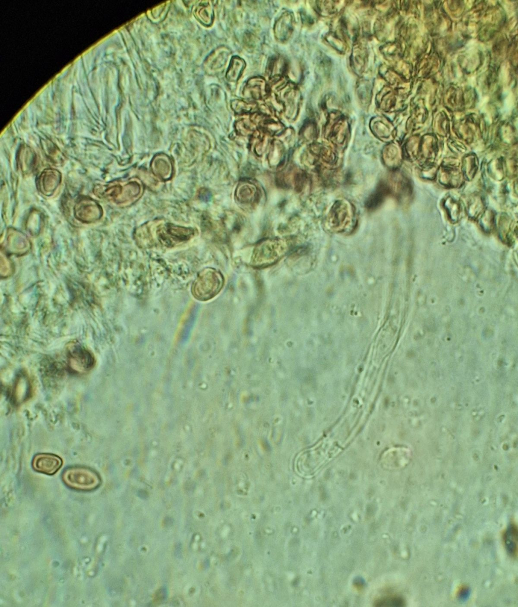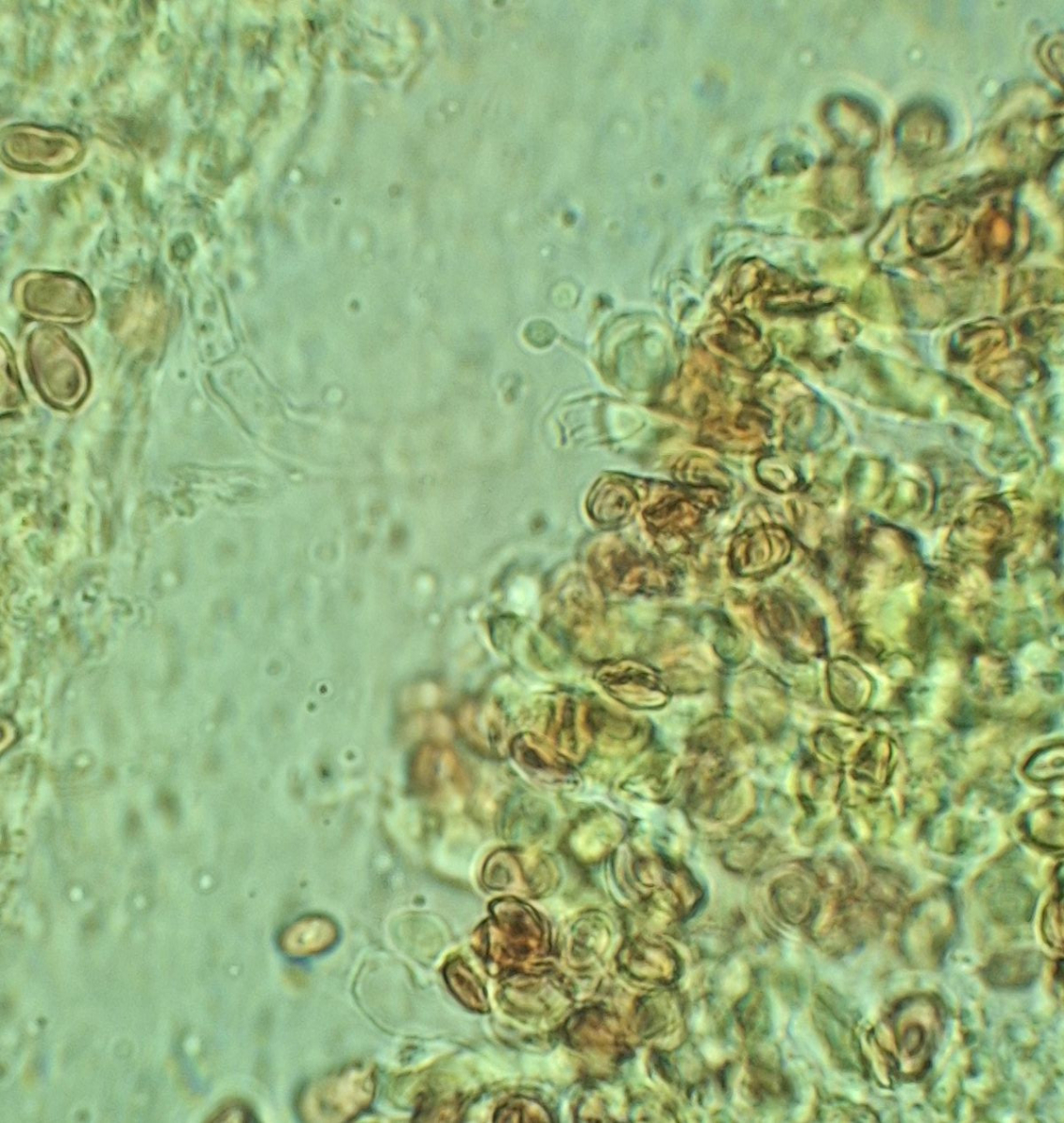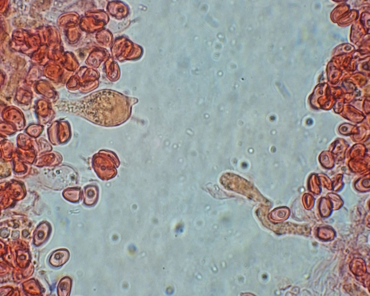 Die einzelnen relativ großen Sporen könnten durch ein- oder zweisporige Basidien erzeugt worden sein, so wie es auf deinen Mikrobildern zu erahnen ist und wie sie bei dieser Art auch vorkommen.