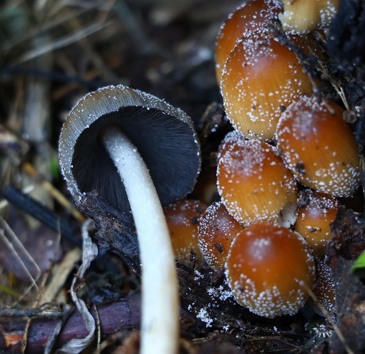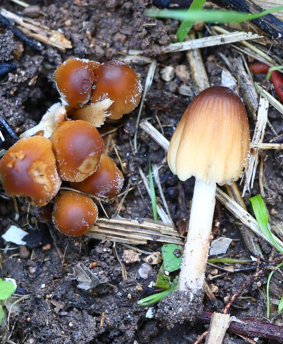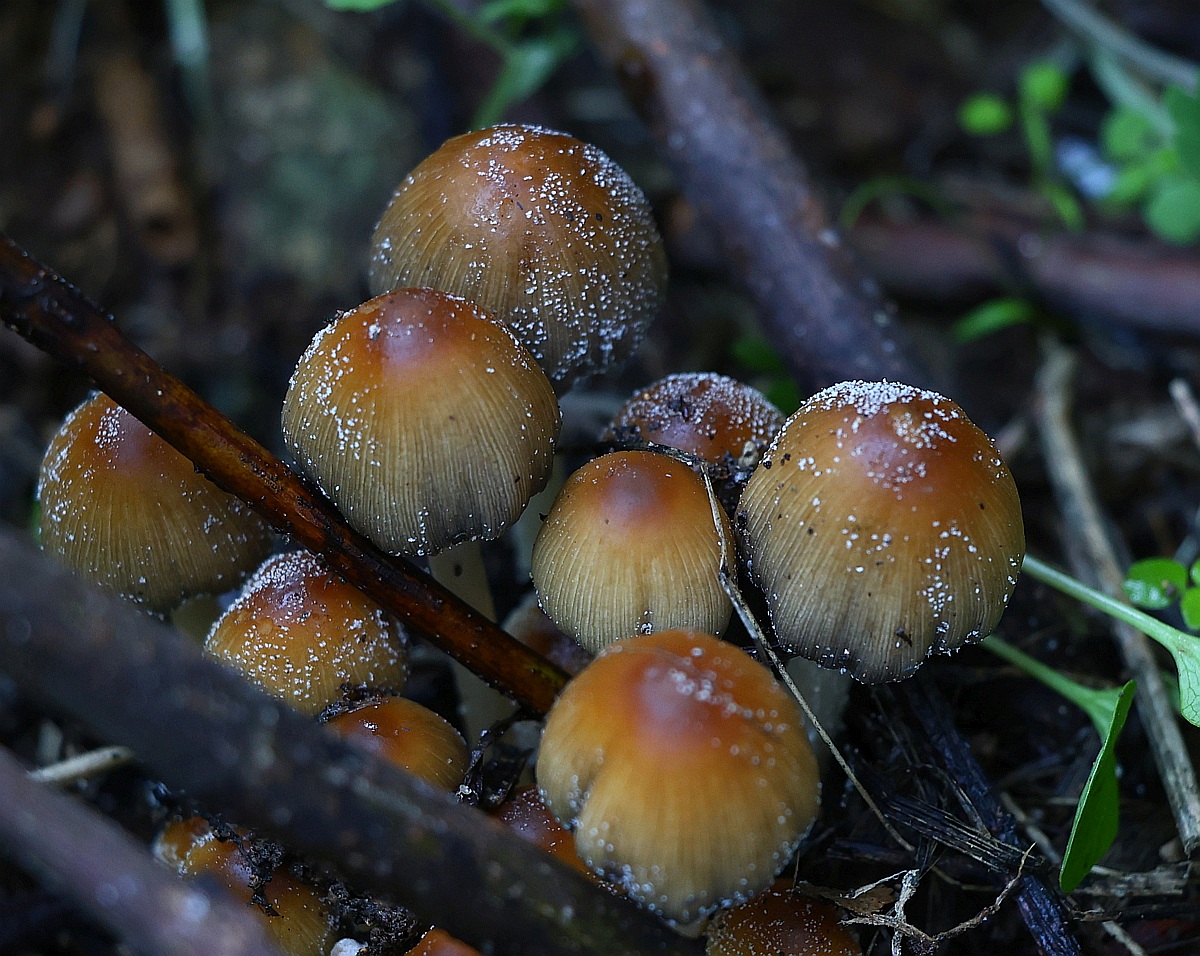 Hello, I have found small clusters of this beautiful Coprinellus with pure white veil remnants made of globular hyphae. Stipe has some pruinosity fine short fibrillose hairs. Spores seem shield-shape for me with the dimensions of Me = 9.7 × 6.5 µm ; Qe = 1.5 ; Ve = 218 µm3. Pleurocystida present, large, Cheilocystidia covering the entire gill edge. I think it is Coprinellus micaceus , opinions?