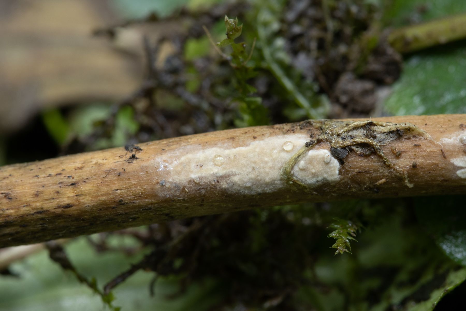 Zuerst war ich felsenfest davon überzeugt eine Radulomyces rickii gefunden zu haben, auch wegen den kurzgestielten Basidiolen.