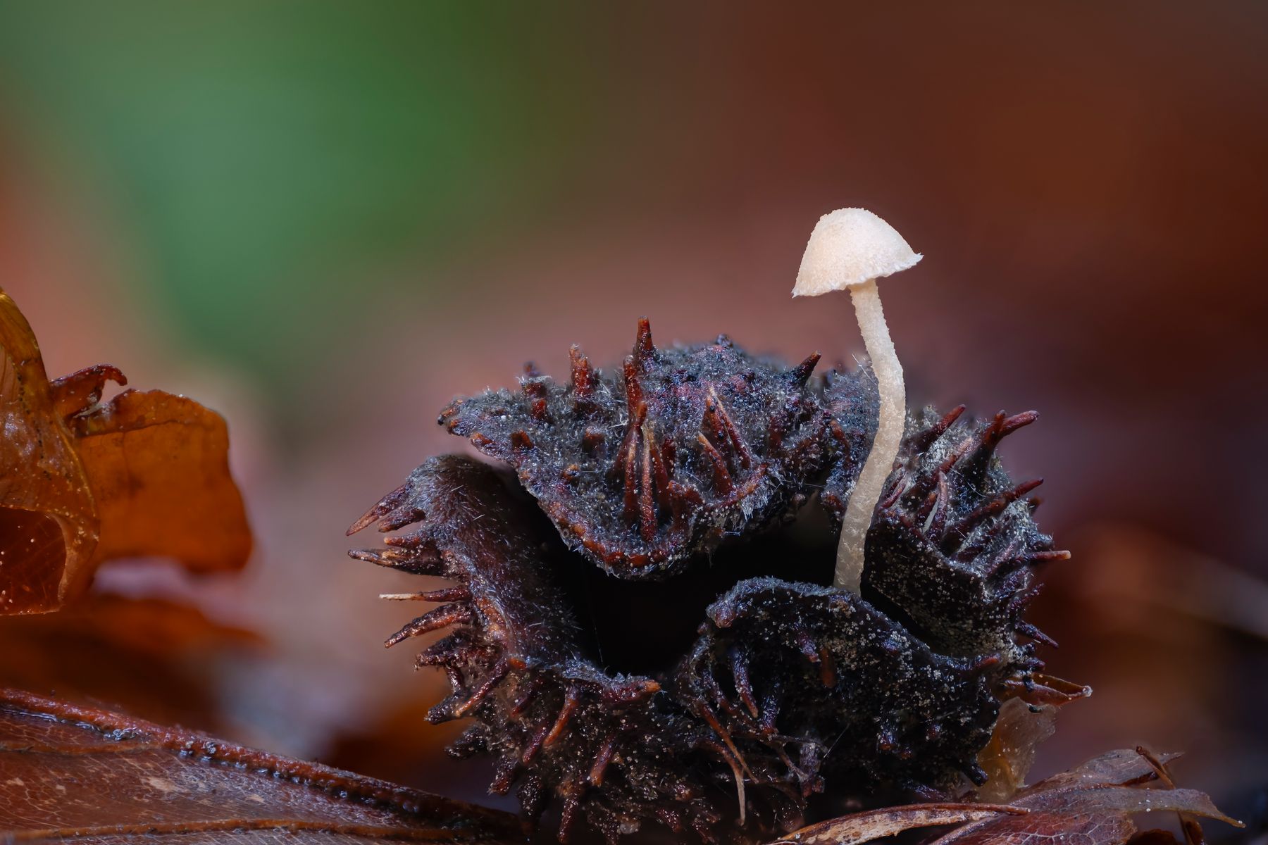Die beiden Pilze sind übrigens auf der Rückseite des Blattes gewachsen. Ich bin mir sehr sicher, dass es sich um Buchenwald-Flockenschüpplinge handelt. Es gab für wenige Tage dutzende davon. Einige wuchsen sogar auf Bucheckern - im Vorjahr an der selben Stelle auch aus ihnen heraus: