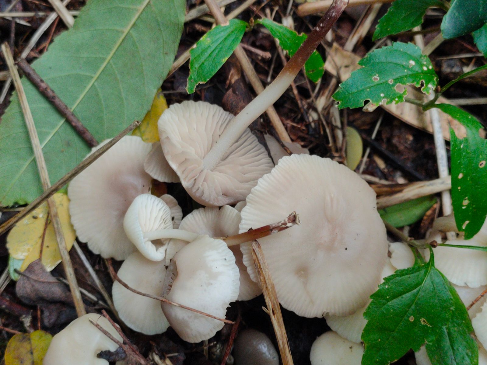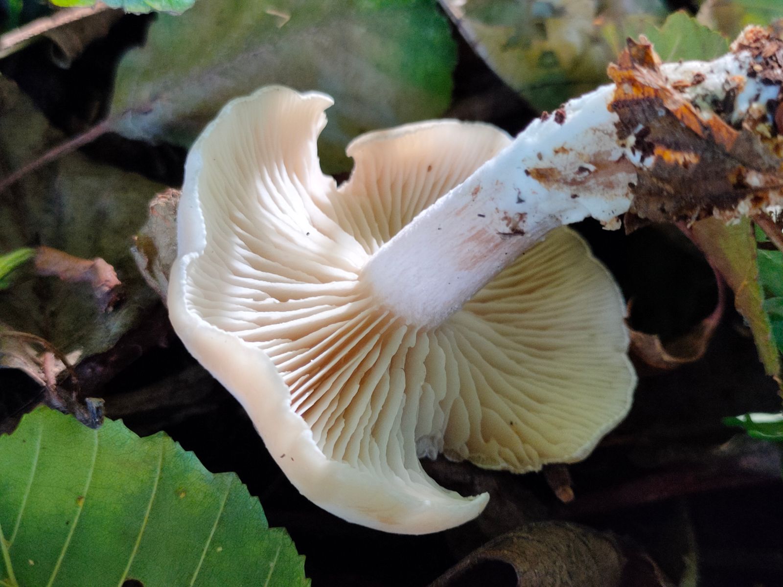 5. Ein weißer hygrophaner Schneckling? Dieser gut richende FK wurde am Bachlauf unter Erlen gefunden. Der FK hat vielleicht ca 8-10 cm im Durchmesser und aus meiner Sicht
