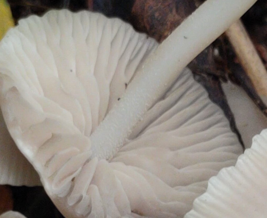 Bei genauer Betrachtung zeigt der Stiel apikal eine weiße Beflockung. Die Lamellen schätze ich als nur leicht angeheften ein.
