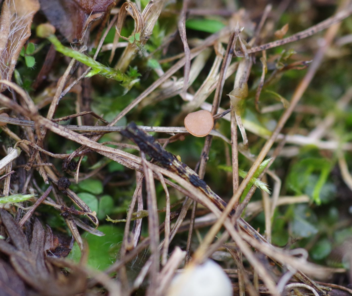 an Gras auf 'ner Magerwiese habe ich diesen kleinen (2,5 mm) Becher mitgebracht. Zum Substrat hin verjüngt, aber kein Stiel. Relativ fleischig. Der Rand ist etwas dunkler.