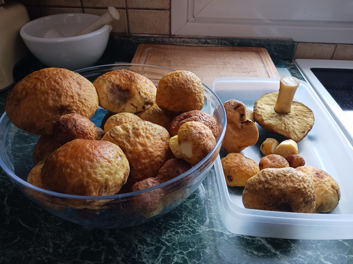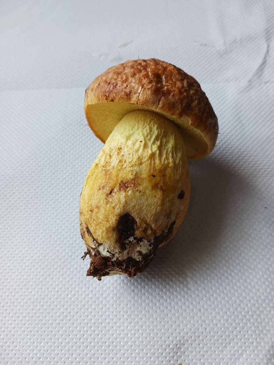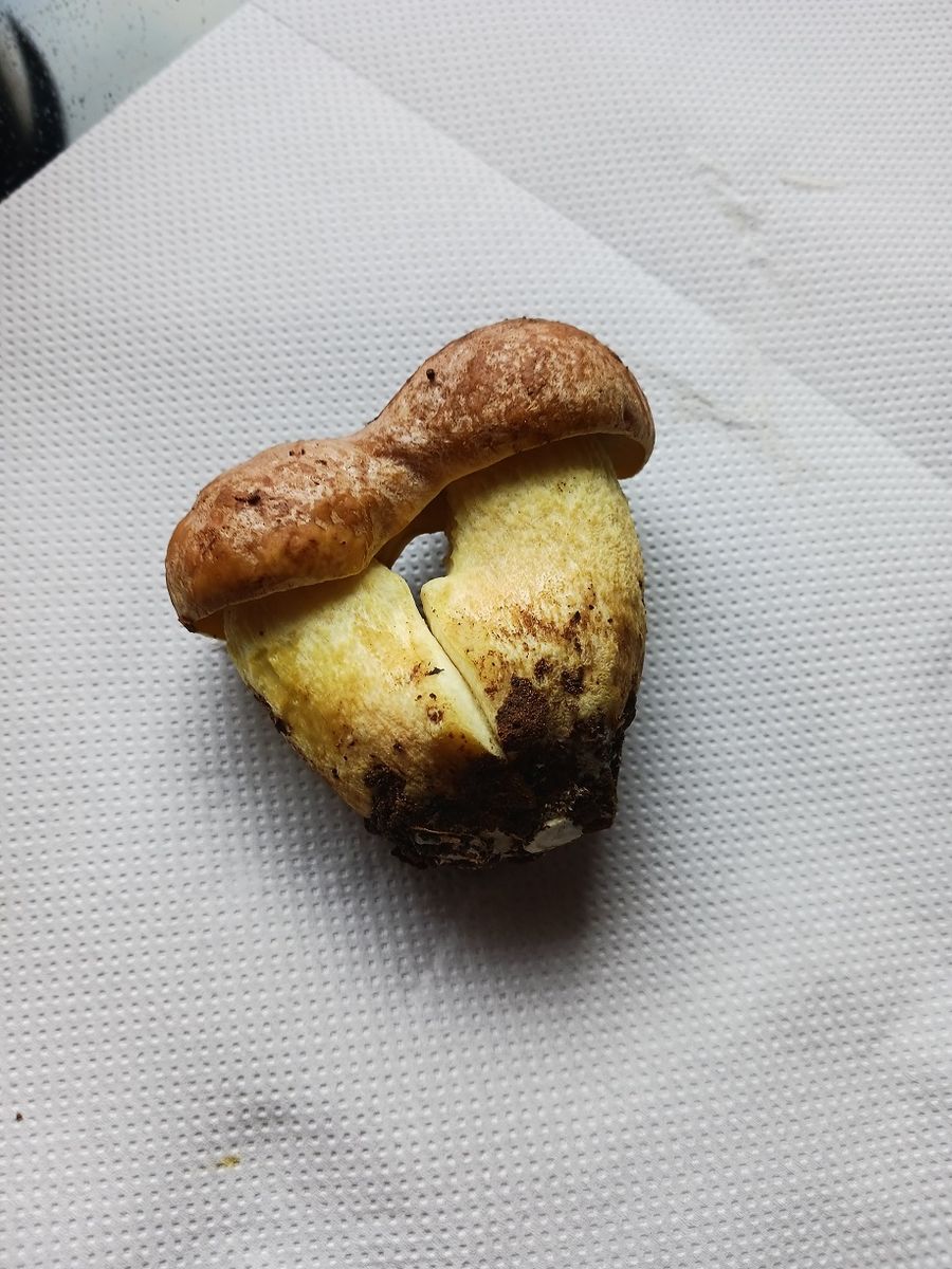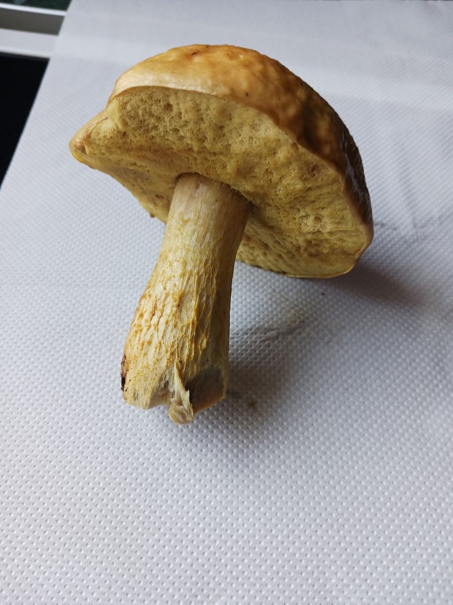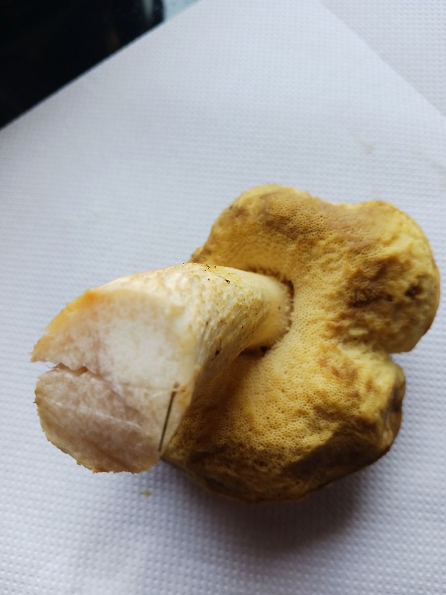 Stiel und Röhren sind gelb, die Oberfläche des Hutes "steinig", etwas gedellt, nicht schmierend, Pilz insgesamt nicht blauend, mild riechend. Mich macht nur der etwas gedellte Hut stutzig, aber vielleicht muss das ja so ... Dieses Jahr nach der sommerlichen Dauer-Hitzewelle ist pilzseitig sowieso ganz anders als andere ...