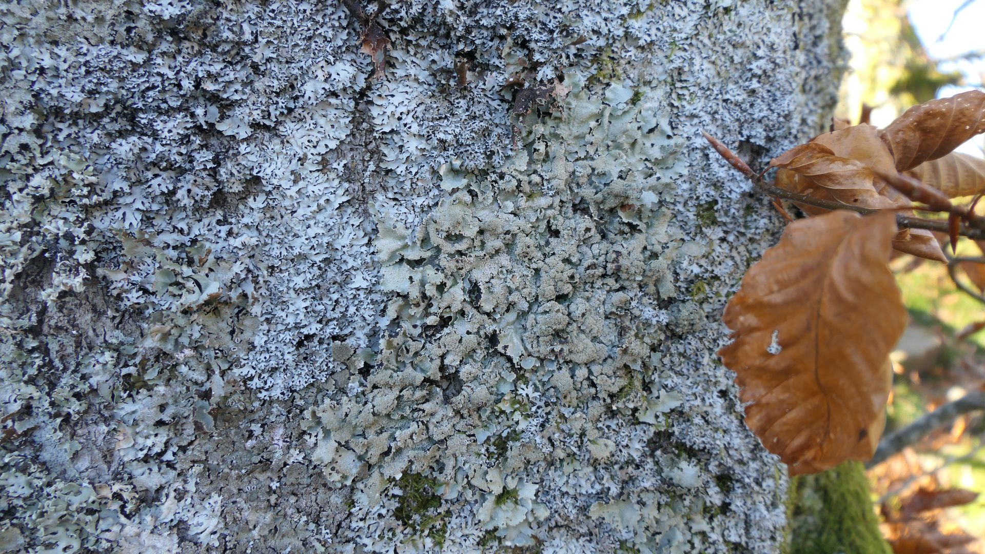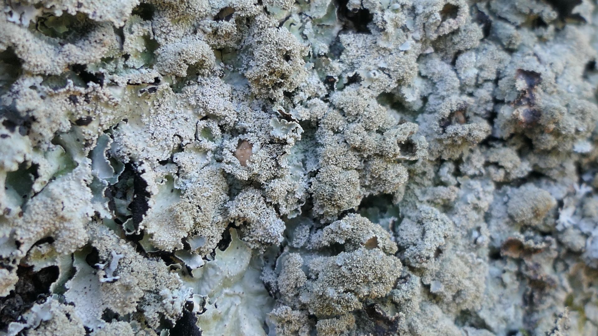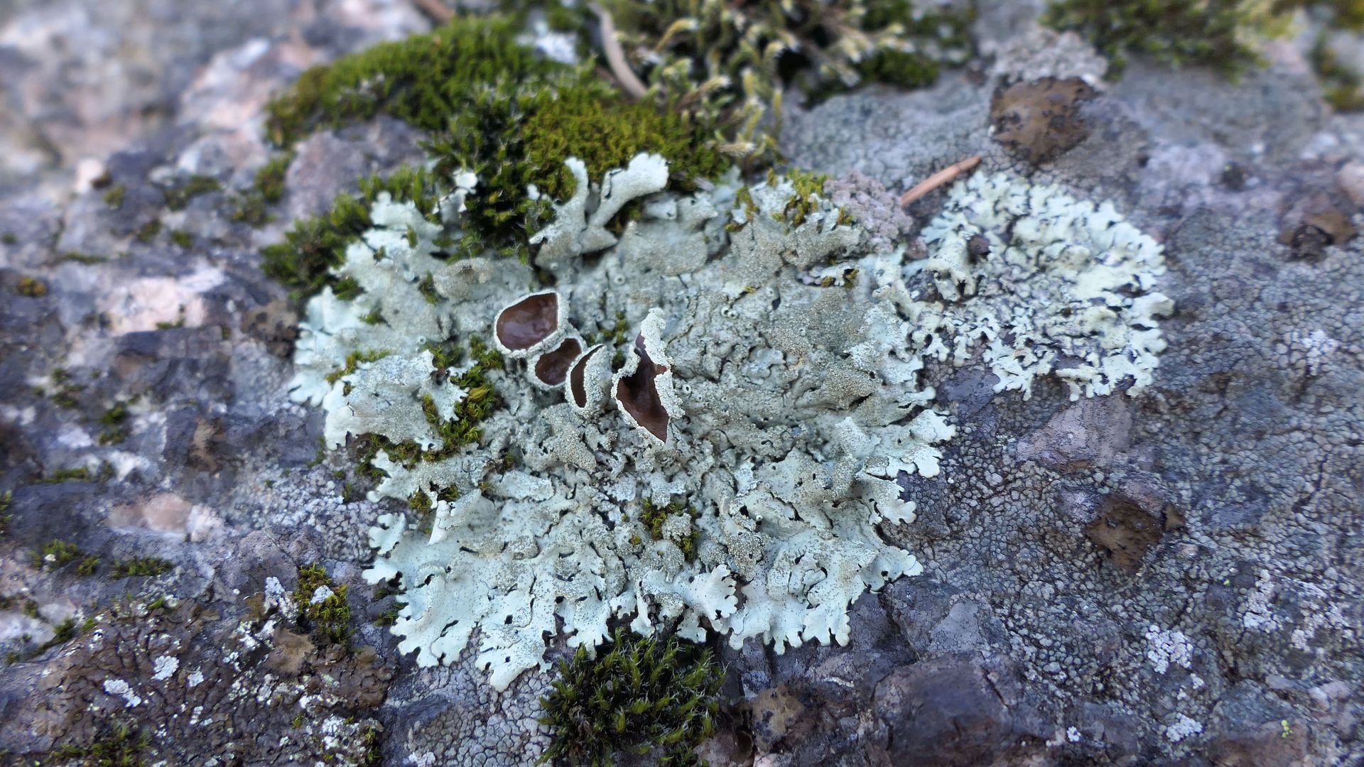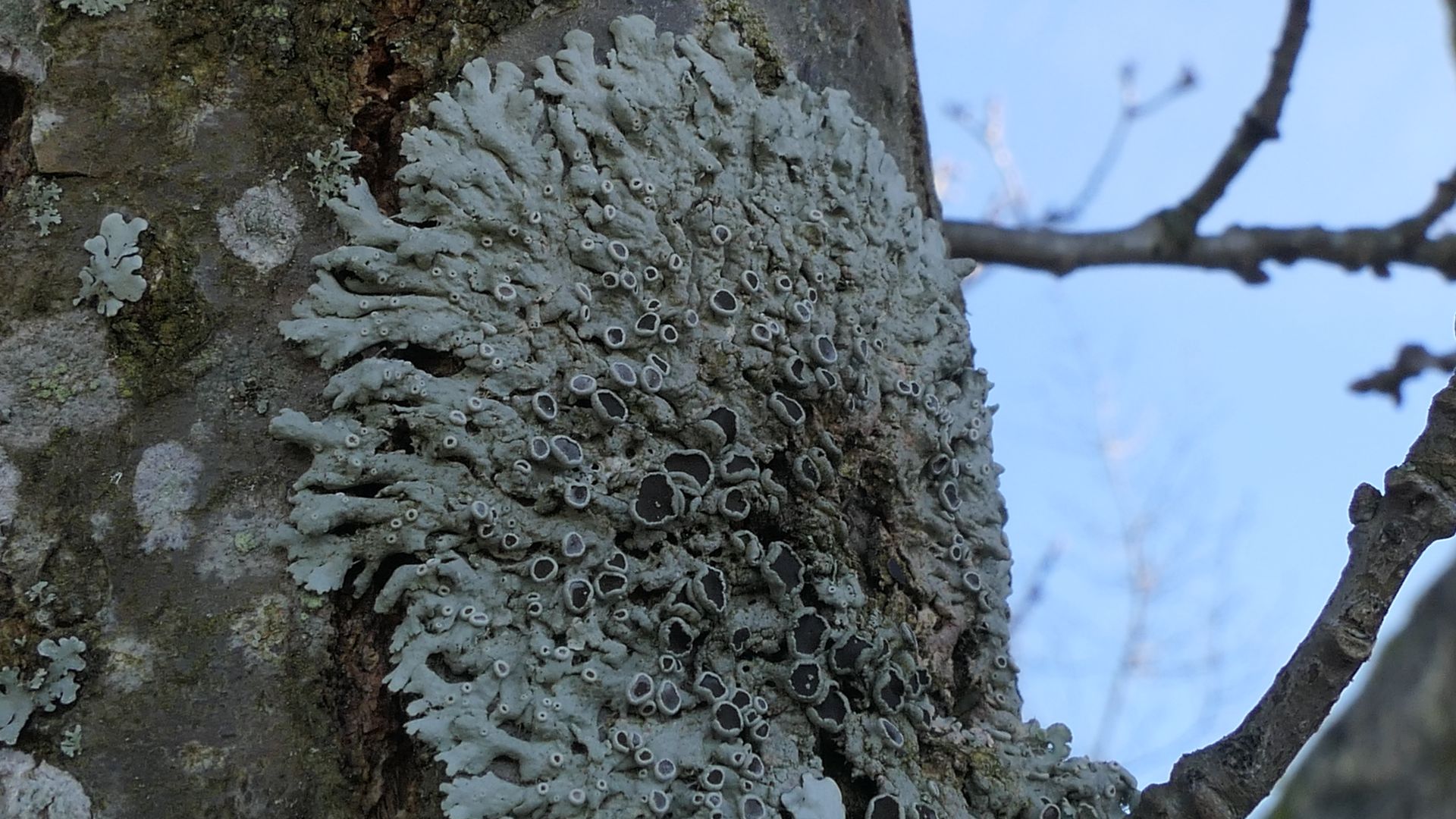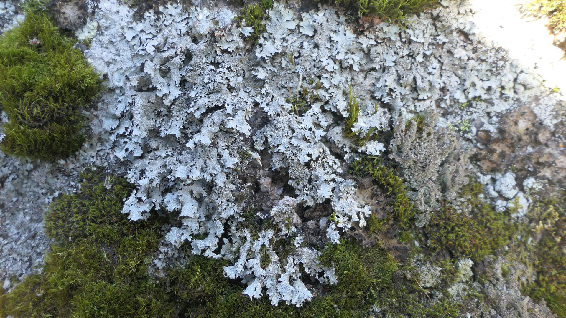 Die Parmelia rechts im Bildentrum ist auffällig - breite, rundliche Loben; dichte, helle Isidien.