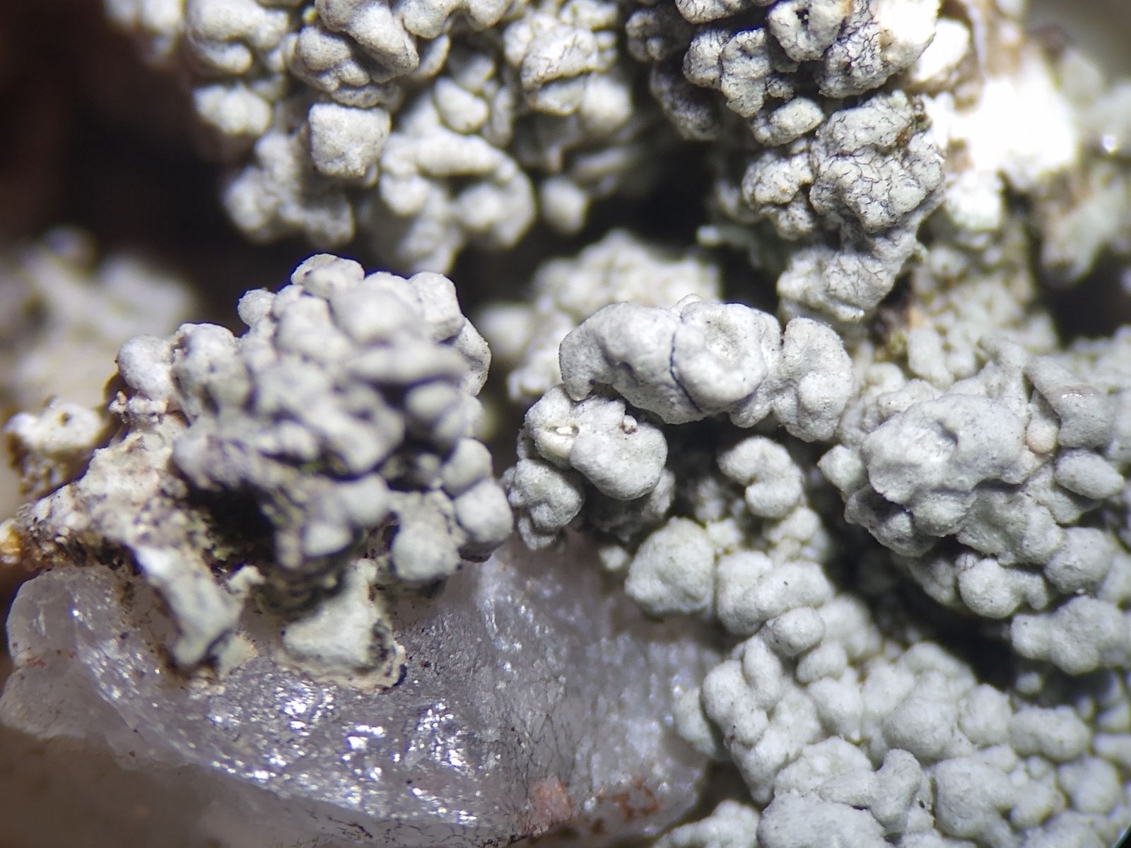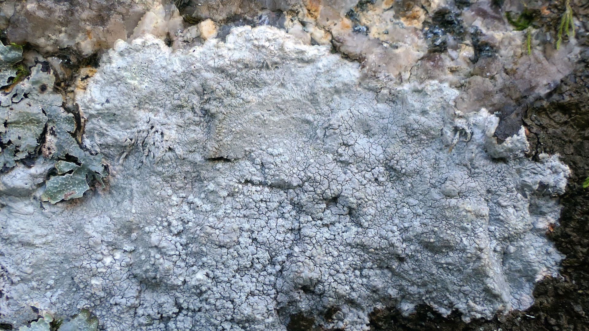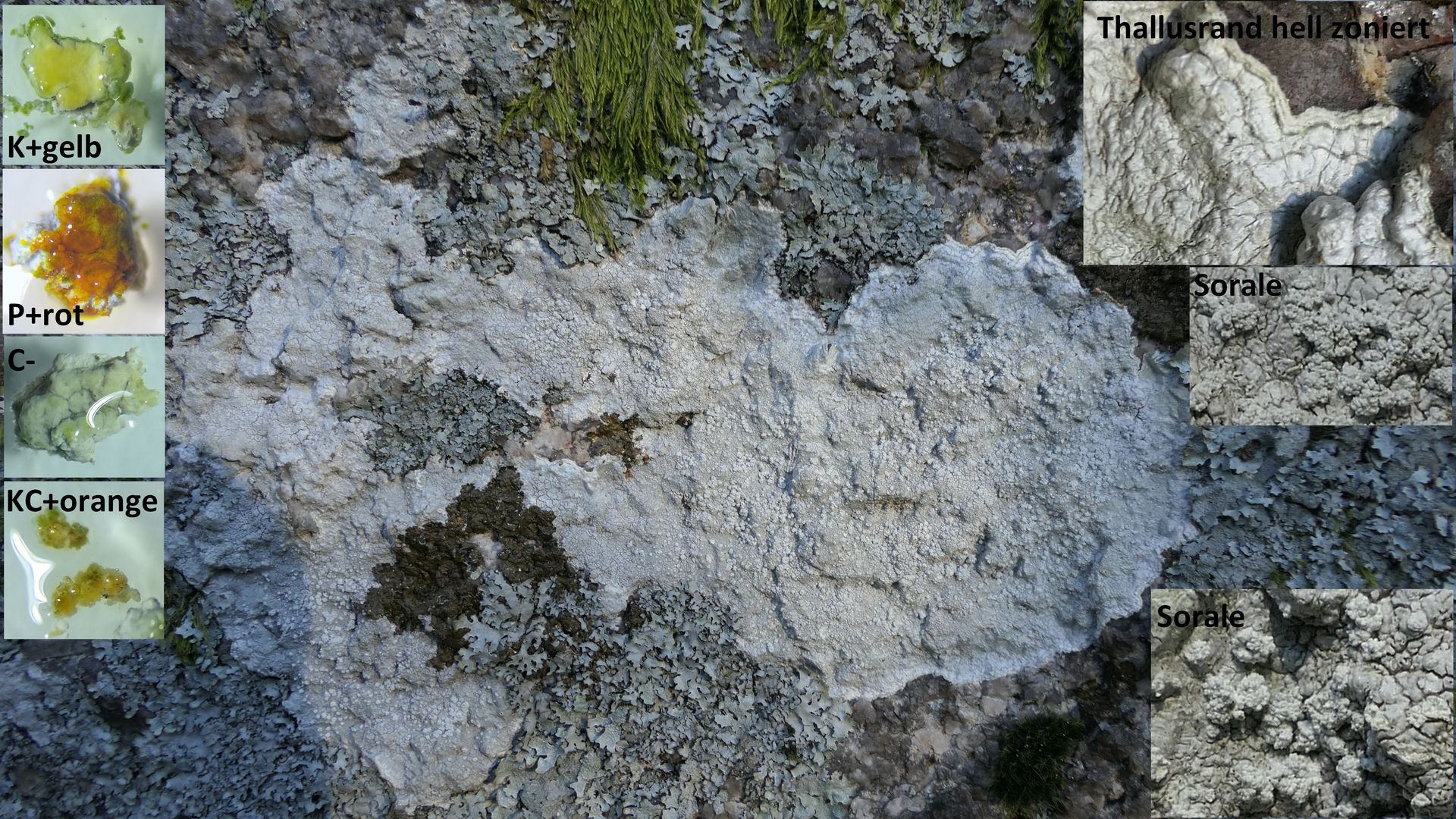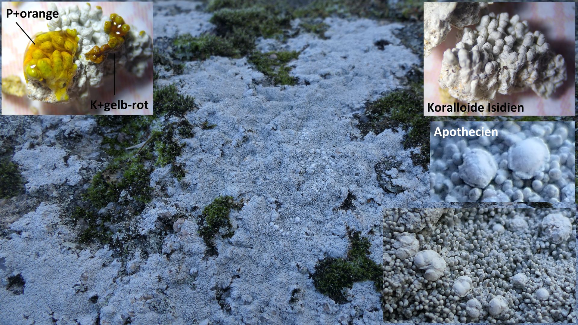 Auf der Nordseite befinden sich große weiße Flächen von Pertusaria corallina. Die Stelle scheint günstig zu sein, denn die Flechte bildet ausnahmsweise auch Apothecien aus.