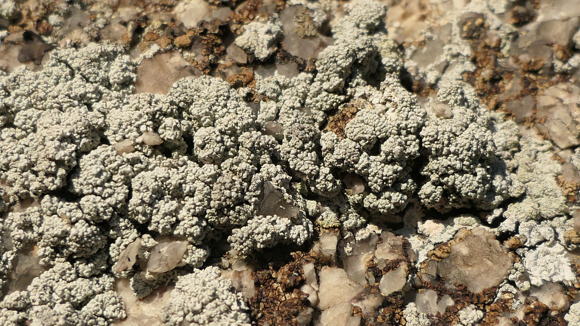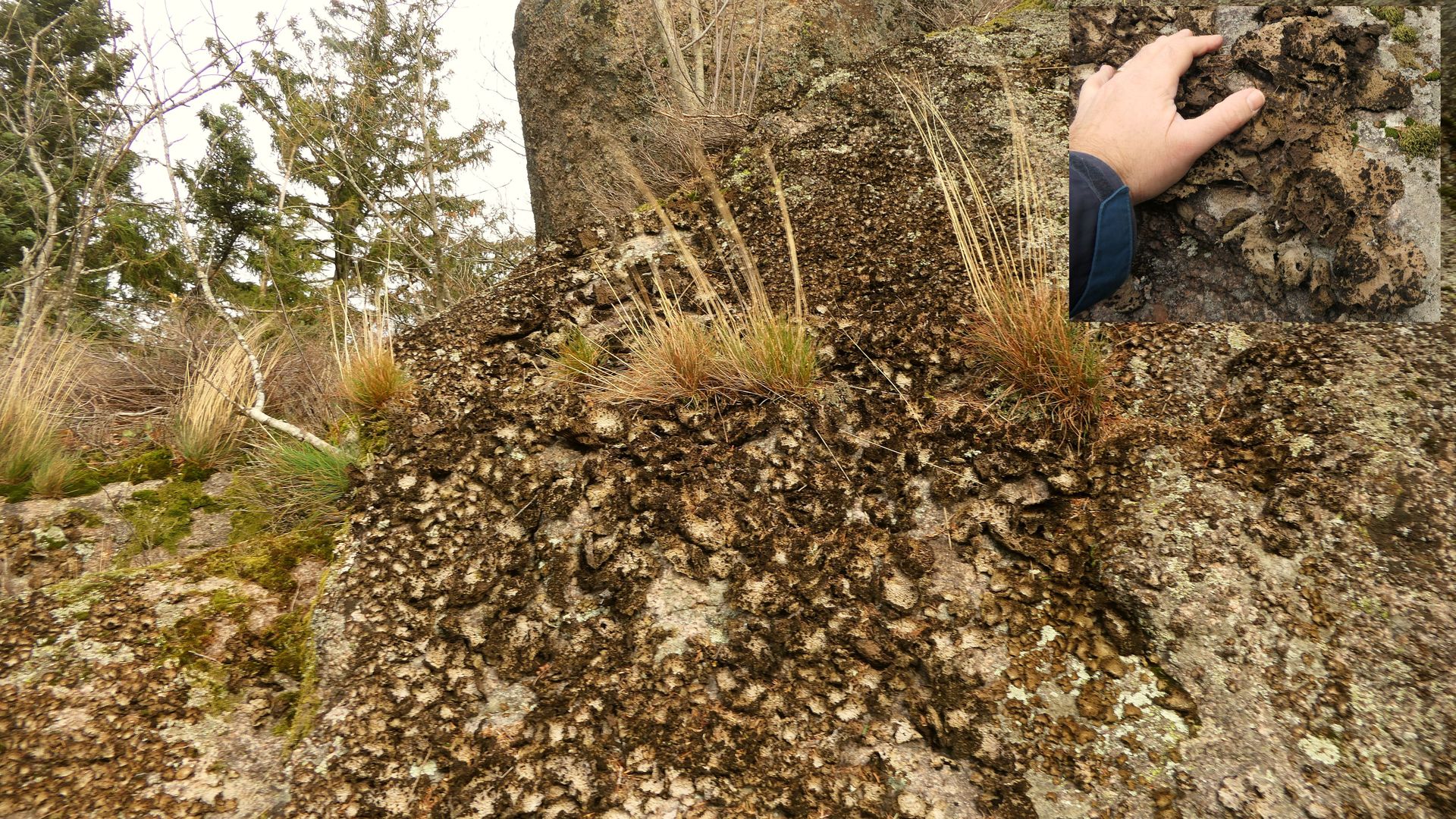 Die exponierten Felsseiten, die nach Süden und in Richtung Tal weisen, sind üppig mit Lasallia pustulata überwachsen: