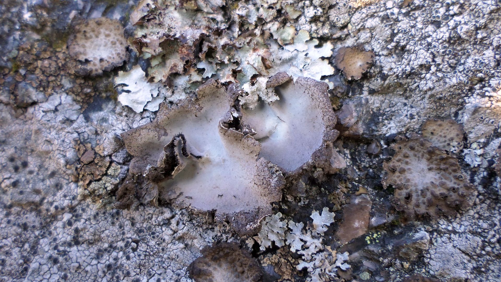 Bild 18 Neben Lasallia pustulata findet sich auch die graue Umbilicaria hirsuta häufig ein. Dünn und spröde, die Ränder nach unten gebogen, am Rand sorediös auflösend, Unterseite dicht mit dunklen Rhizinen besetzt. Ich erkenne häufig im Grau einen deutlich lila Farbton, der aber nicht beschrieben wird.