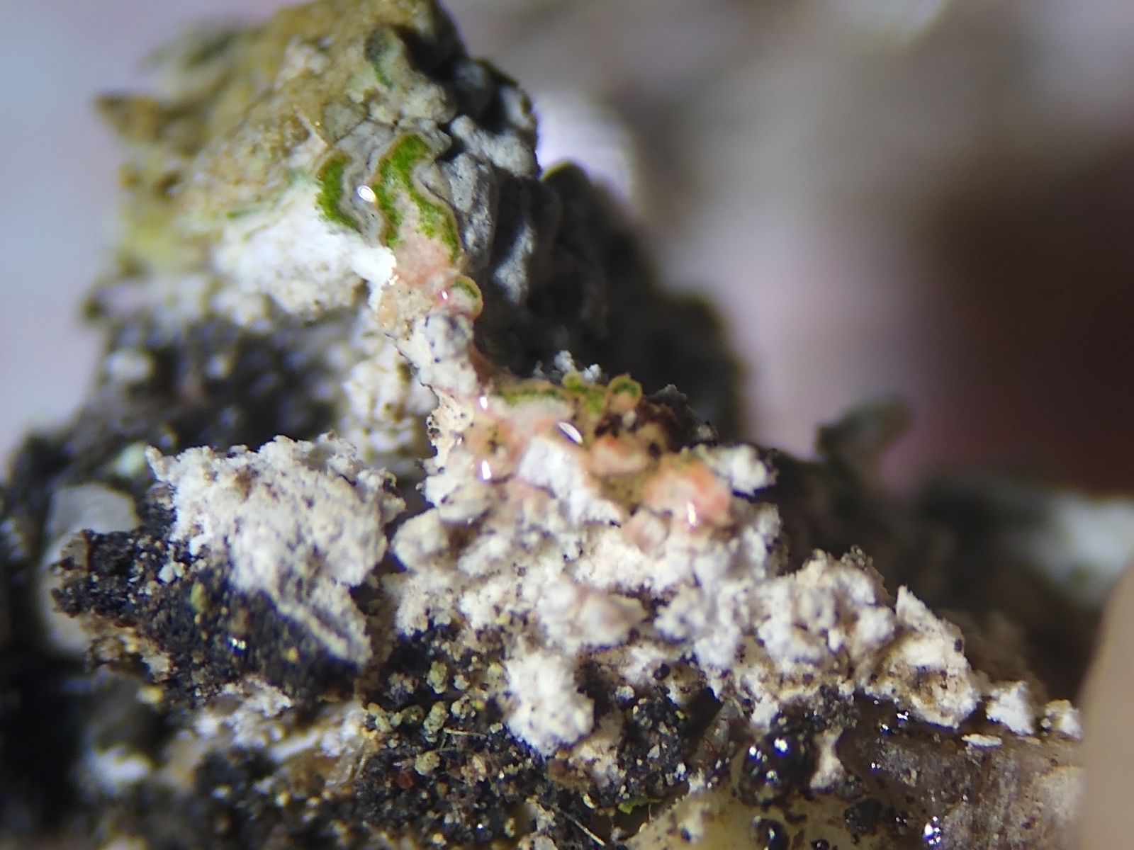 Bild 14b Psilolechia lucida: Dünne, grünlich gelbe, fein mehlige Krusten. Die Apothecien sind winzig sehr klein (bis 400µm), intensiv gelb und randlos.