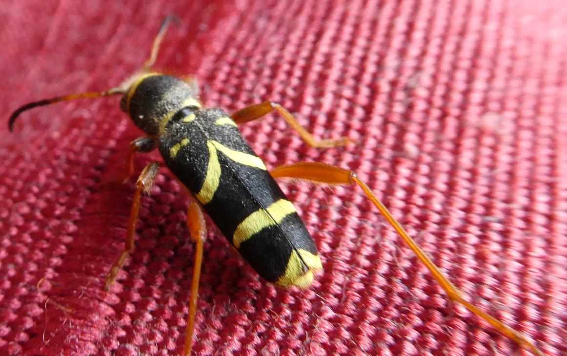 das ist raffiniert, der Käfer tarnt sich als Wespe. Auf den ersten Blick und von Weiten gelingt das bestimmt.