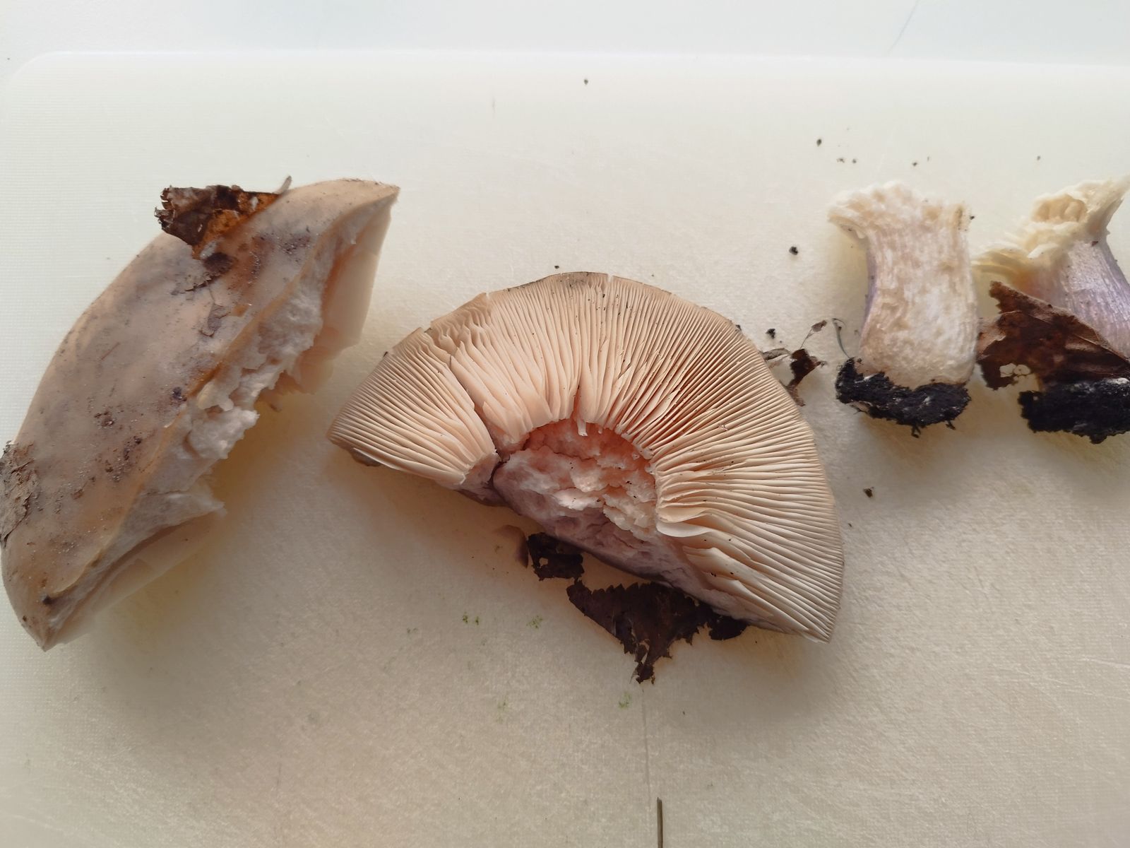 Aussehen: Stiel Violett, Hut Ocker/Braun, Lamellen Weiß/Beige und eng stehend, keine Knolle, keine Velumreste o.Ä.