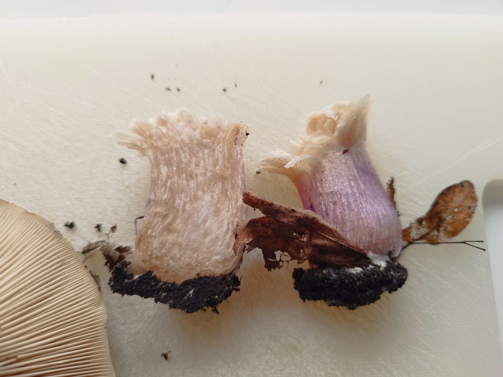 Aussehen: Stiel Violett, Hut Ocker/Braun, Lamellen Weiß/Beige und eng stehend, keine Knolle, keine Velumreste o.Ä.