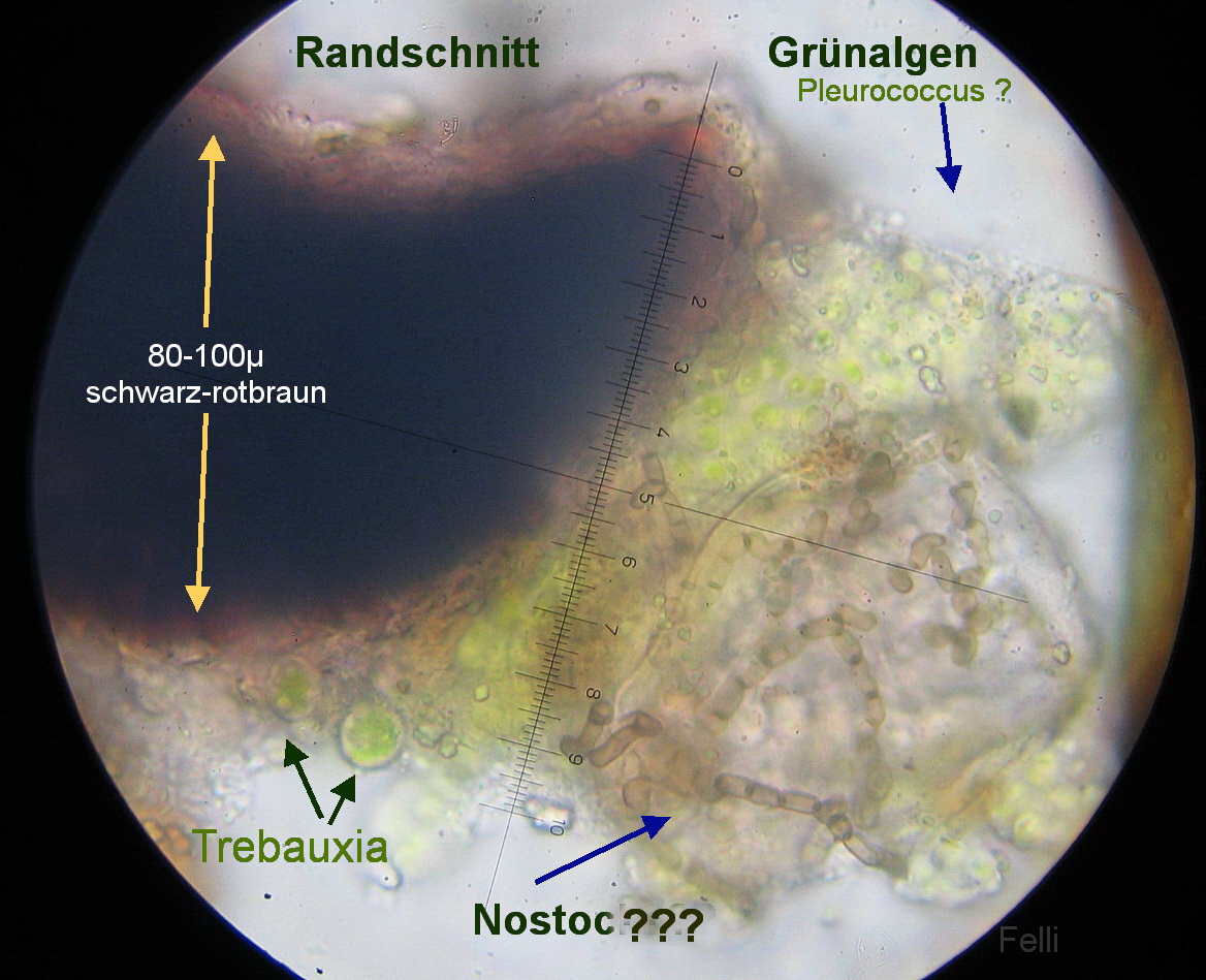 Die Trentepohlia-Algen ("Grünalgen 2", mit oranger Guttule - Karotinoide) sitzen doch vielleicht eher auf dem Thallus (vgl. auch Eingangsfoto mit Trentepohlia-Puscheln auf der Flechte).