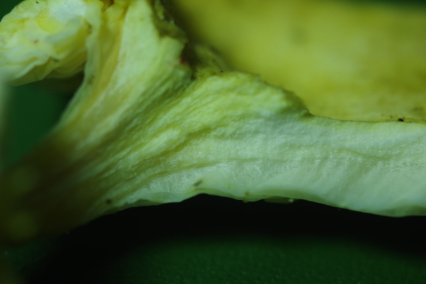 an einer seit längerem toten Kiefer, die in diesem Sommer umgefallen ist, wächst aus Spechtlöchern ein gelblicher Seitling im Büschel. Das größte Exemplar ist etwa 8 cm breit, die kleineren Exemplare wirken noch sehr jung und nicht entwickelt. Geruch unauffällig. Die Oberseite wirkt filzig, die Lamellen sind herablaufend +/- weiß (bei den jungen Exemplaren gelb), recht dick und verzweigt, nicht gesägt, nur an den Verzweigungsstellen mit Absatz. DEr Stiel ist gelblich. Alles relativ zäh und längs reißend.