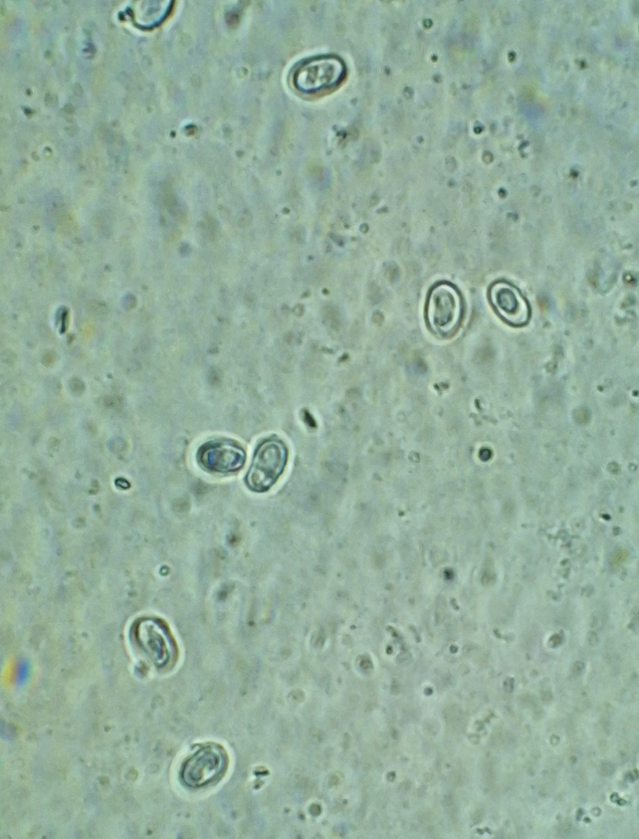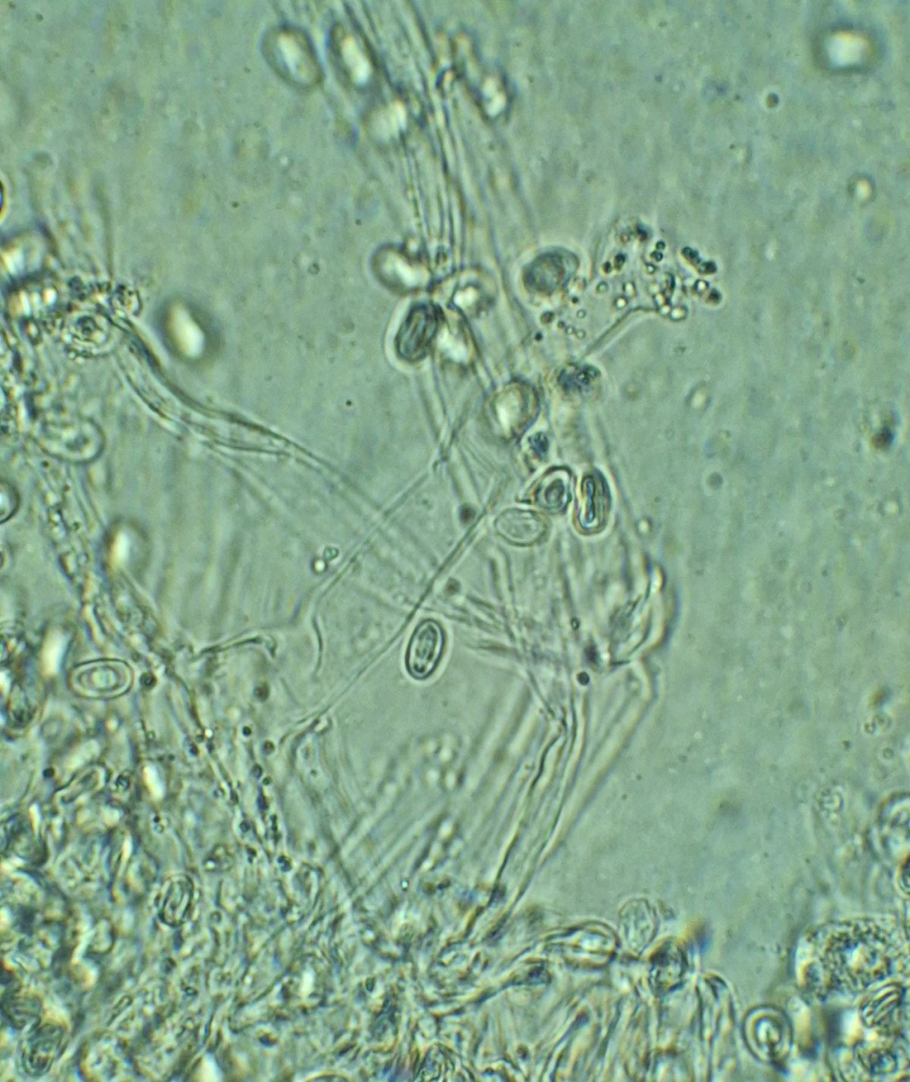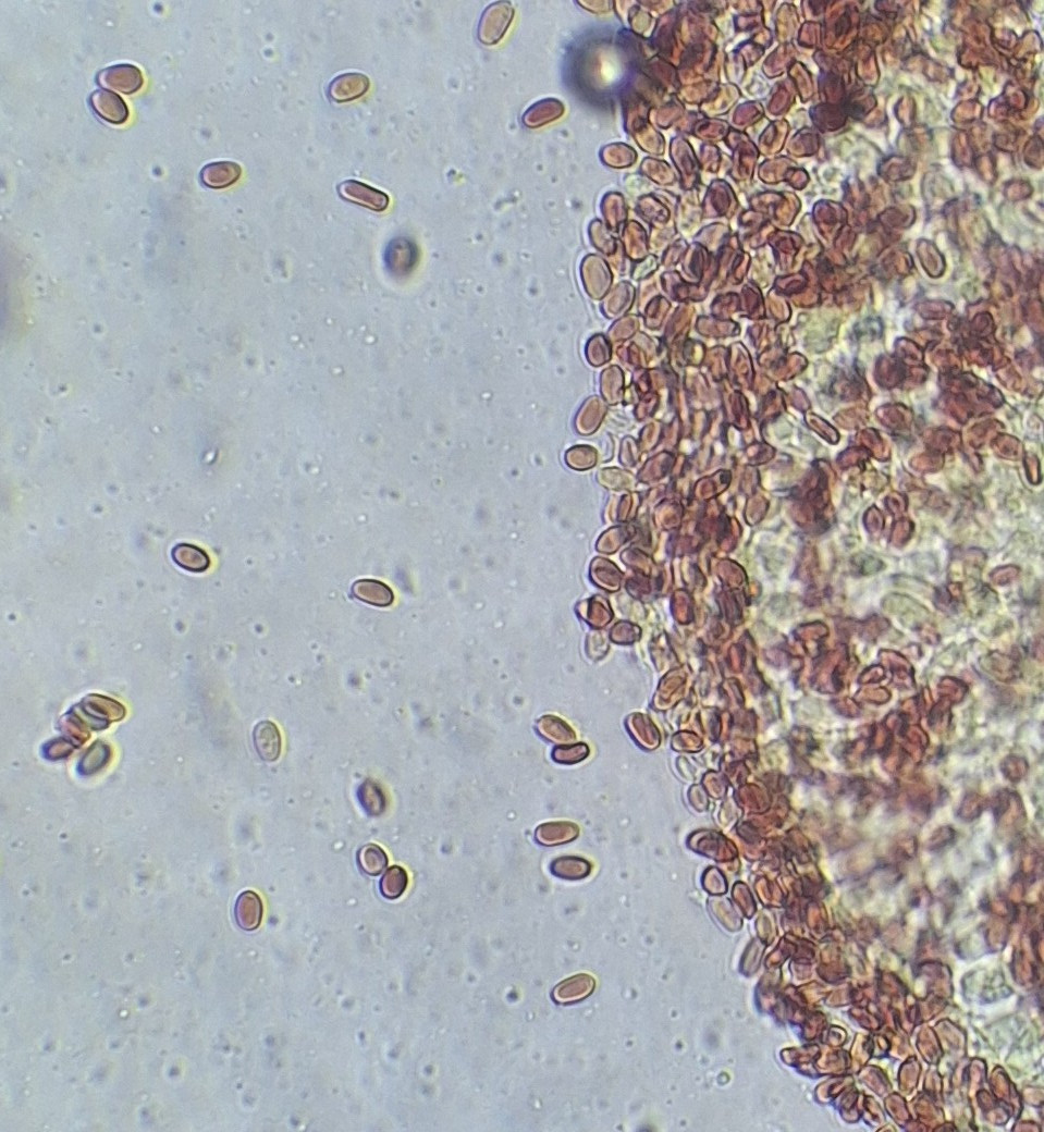 Sporenpulverfarbe habe ich noch nicht. Die Sporen sind etwa 5-7 *3,5-4,5 µm groß, eiförmig bis abgerundet zylindrisch, dickwandig/doppelwandig, ohne Apikulus, hyalin in Wasser, dextrinoid mit Melzers (oder ist die Färbung amyloid?). Zystiden habe ich nicht gefunden. Basidien scheinen 2- und 4-sporig zu sein.