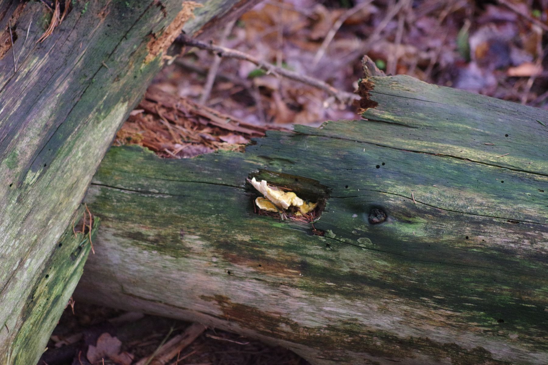 an einer seit längerem toten Kiefer, die in diesem Sommer umgefallen ist, wächst aus Spechtlöchern ein gelblicher Seitling im Büschel. Das größte Exemplar ist etwa 8 cm breit, die kleineren Exemplare wirken noch sehr jung und nicht entwickelt. Geruch unauffällig. Die Oberseite wirkt filzig, die Lamellen sind herablaufend +/- weiß (bei den jungen Exemplaren gelb), recht dick und verzweigt, nicht gesägt, nur an den Verzweigungsstellen mit Absatz. DEr Stiel ist gelblich. Alles relativ zäh und längs reißend.