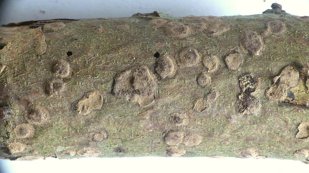 4) immer mit vielen Perithecien und nicht, wie hier, nur vereinzelt einmal ein Stroma mit ganz wenigen Perithecien.