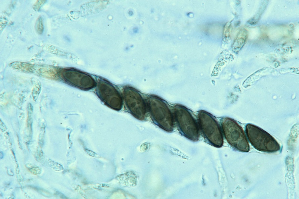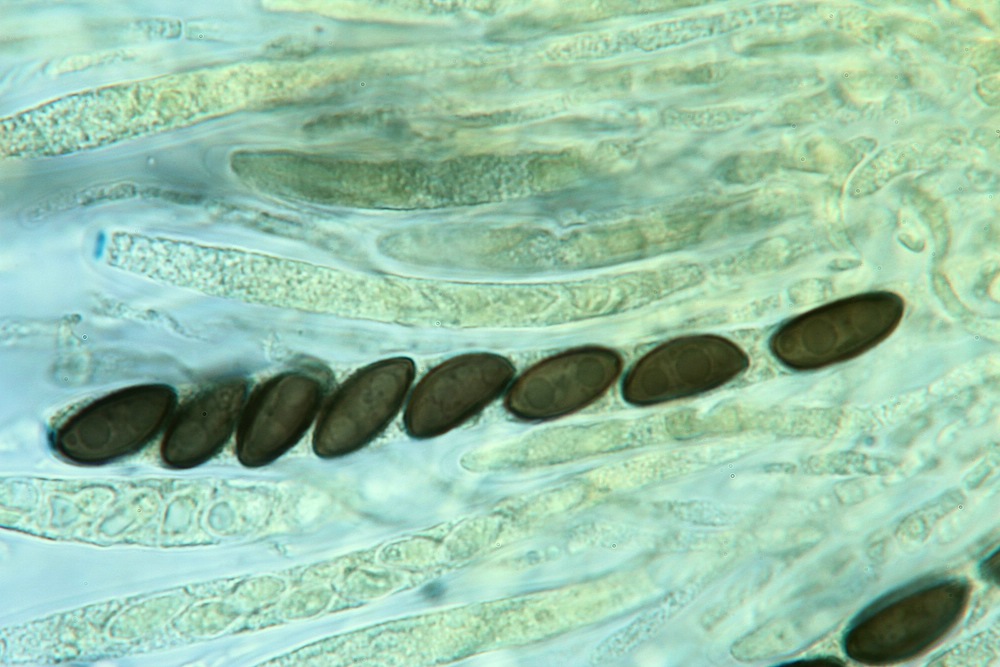 • 1b. KOH-Pigment dunkelbraun, leicht oliv, granules zitronengelb, junge Stromata graubraun pruinose, auf Quercus (Europa), Sp. 11-13.5 × 4.5-5.4 µm, X = 11.6 × 4.8 µm .... H. porphyreum Granmo