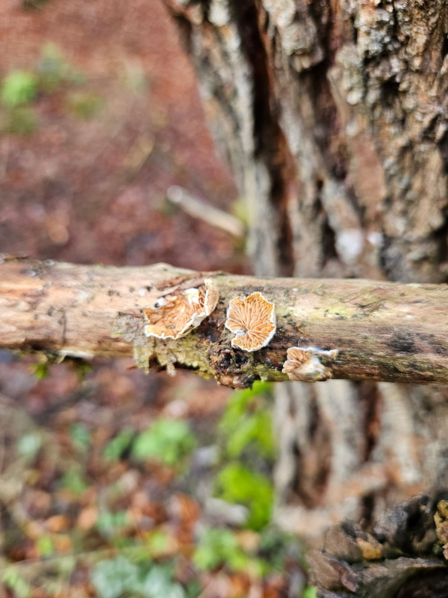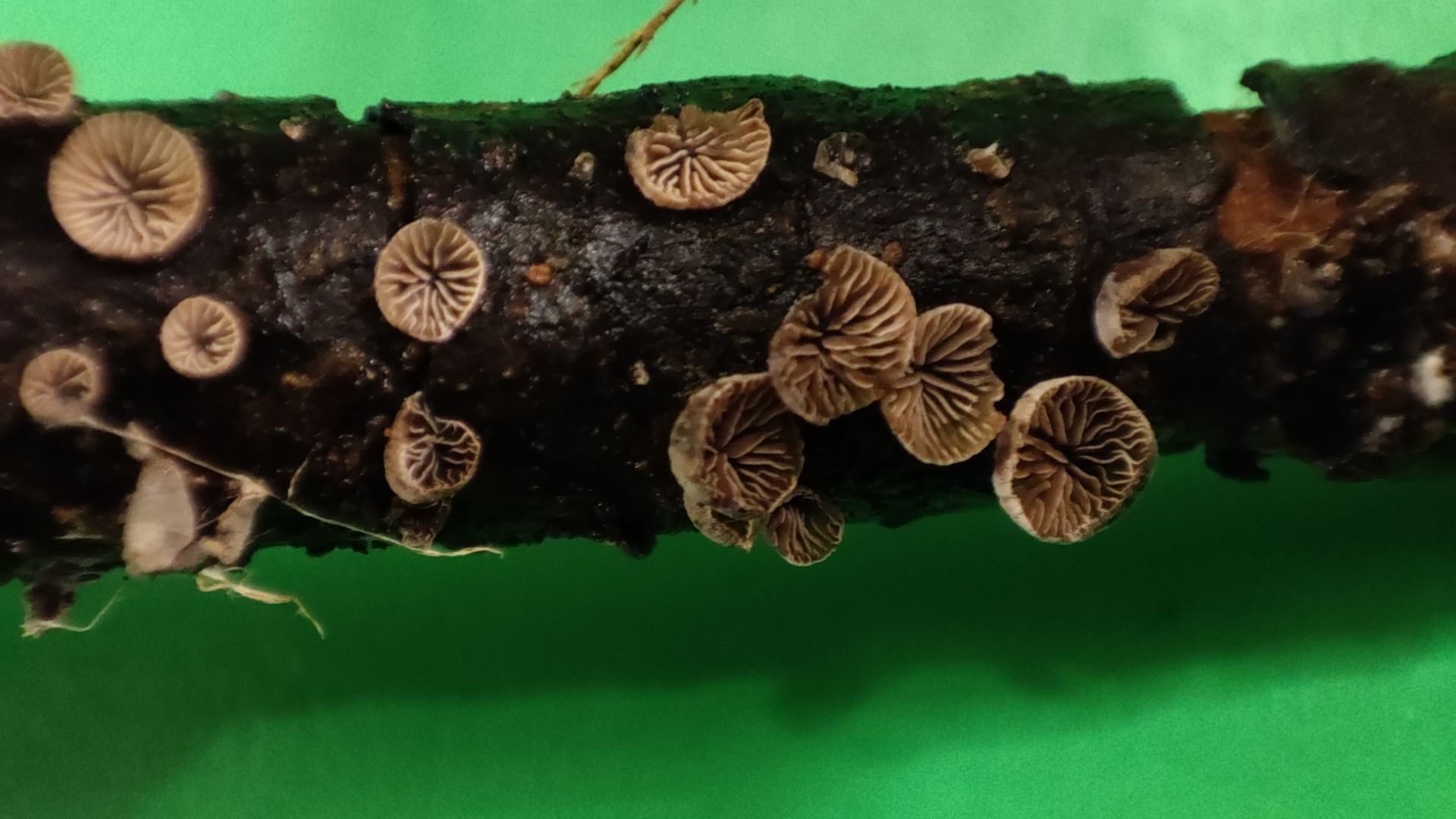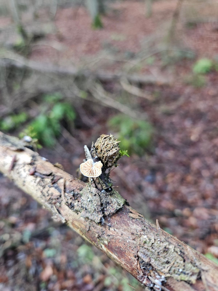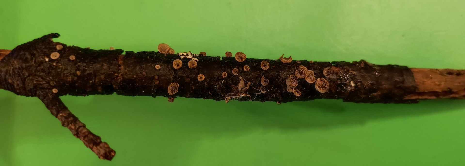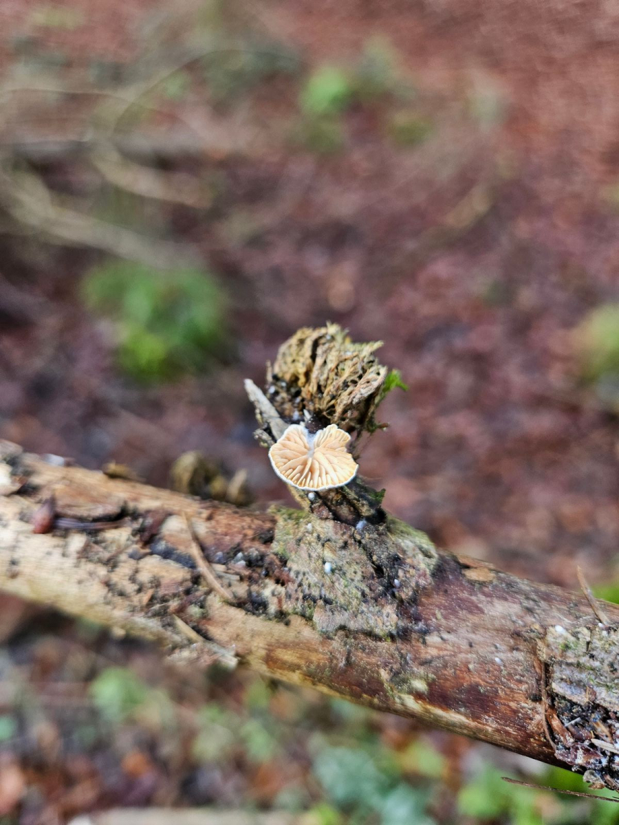 Aber mein "Pilzauge" hatte es rechtzeitig erspäht und ich holte es aus dem Haufen. Ich wurde nicht enttäuscht: Das Ästchen sitzt voller winziger schüsselförmiger Lamellenpilzchen, und mehr Fruchtkörperchen wollen noch sprießen!
