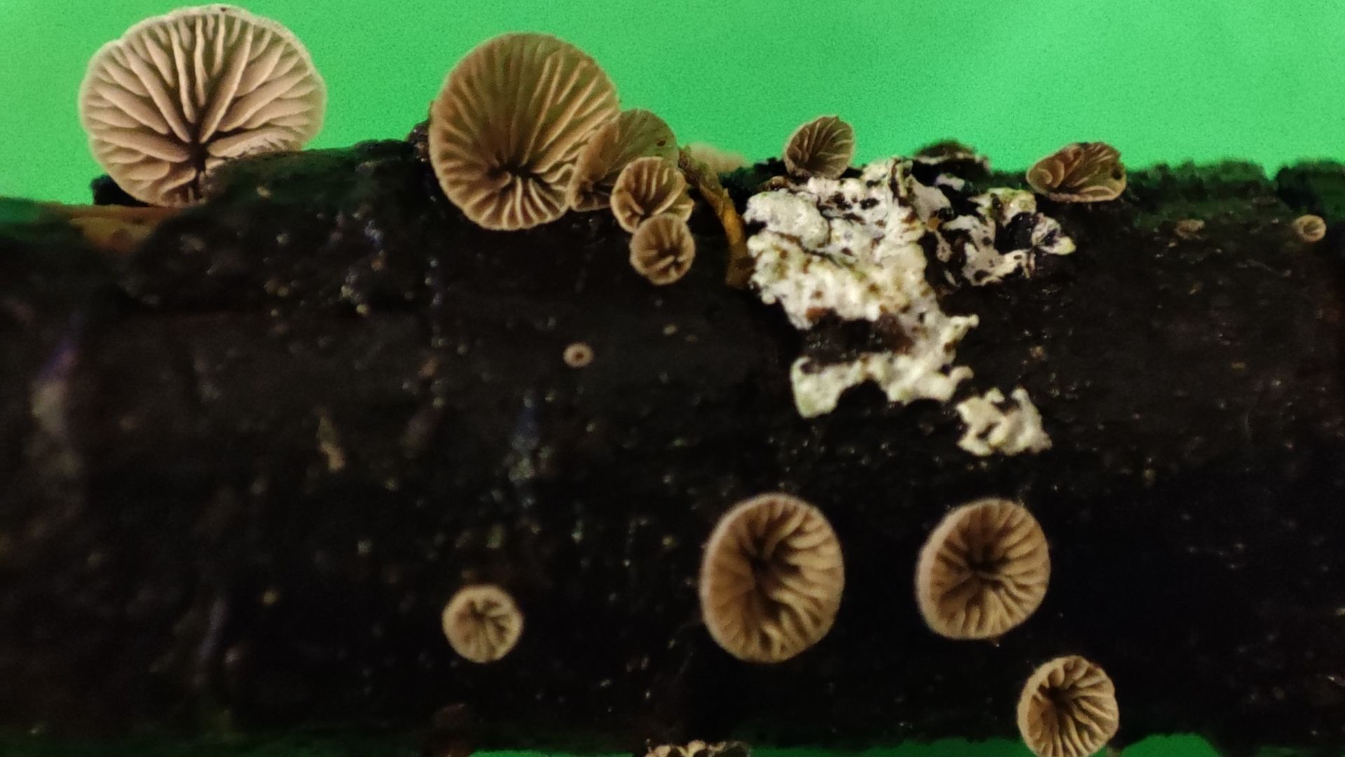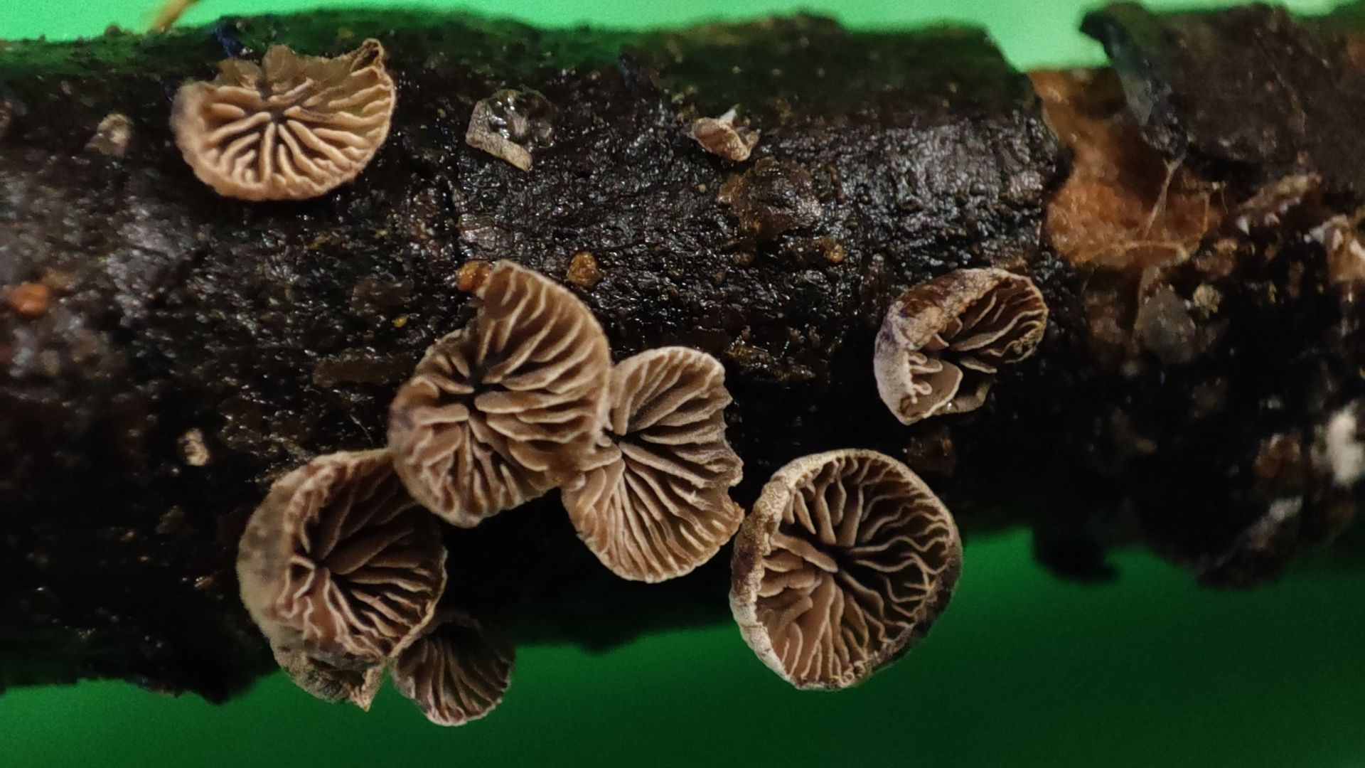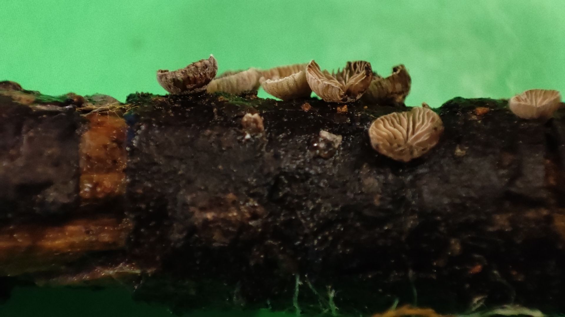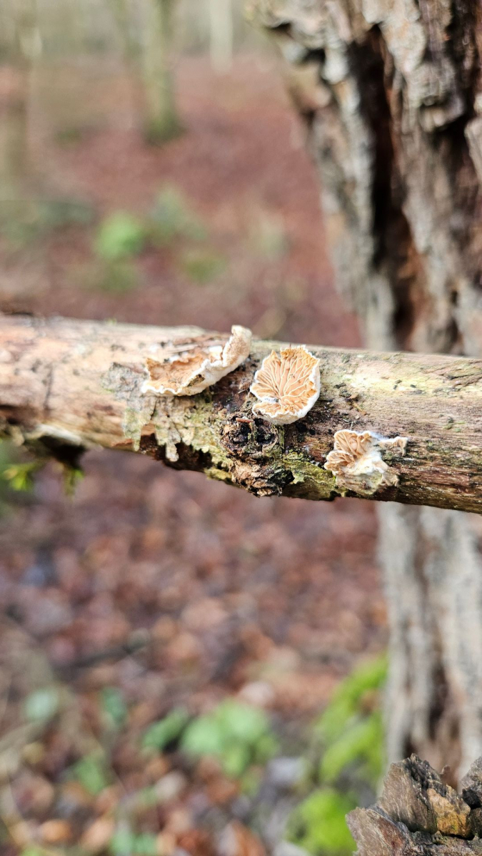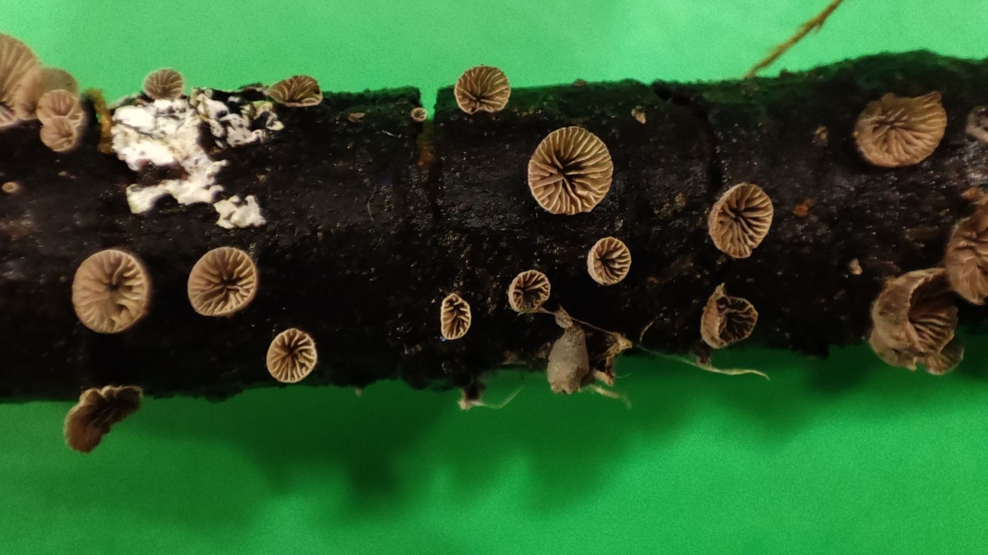 Aber mein "Pilzauge" hatte es rechtzeitig erspäht und ich holte es aus dem Haufen. Ich wurde nicht enttäuscht: Das Ästchen sitzt voller winziger schüsselförmiger Lamellenpilzchen, und mehr Fruchtkörperchen wollen noch sprießen!