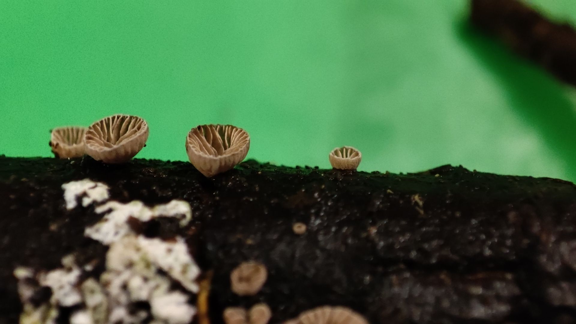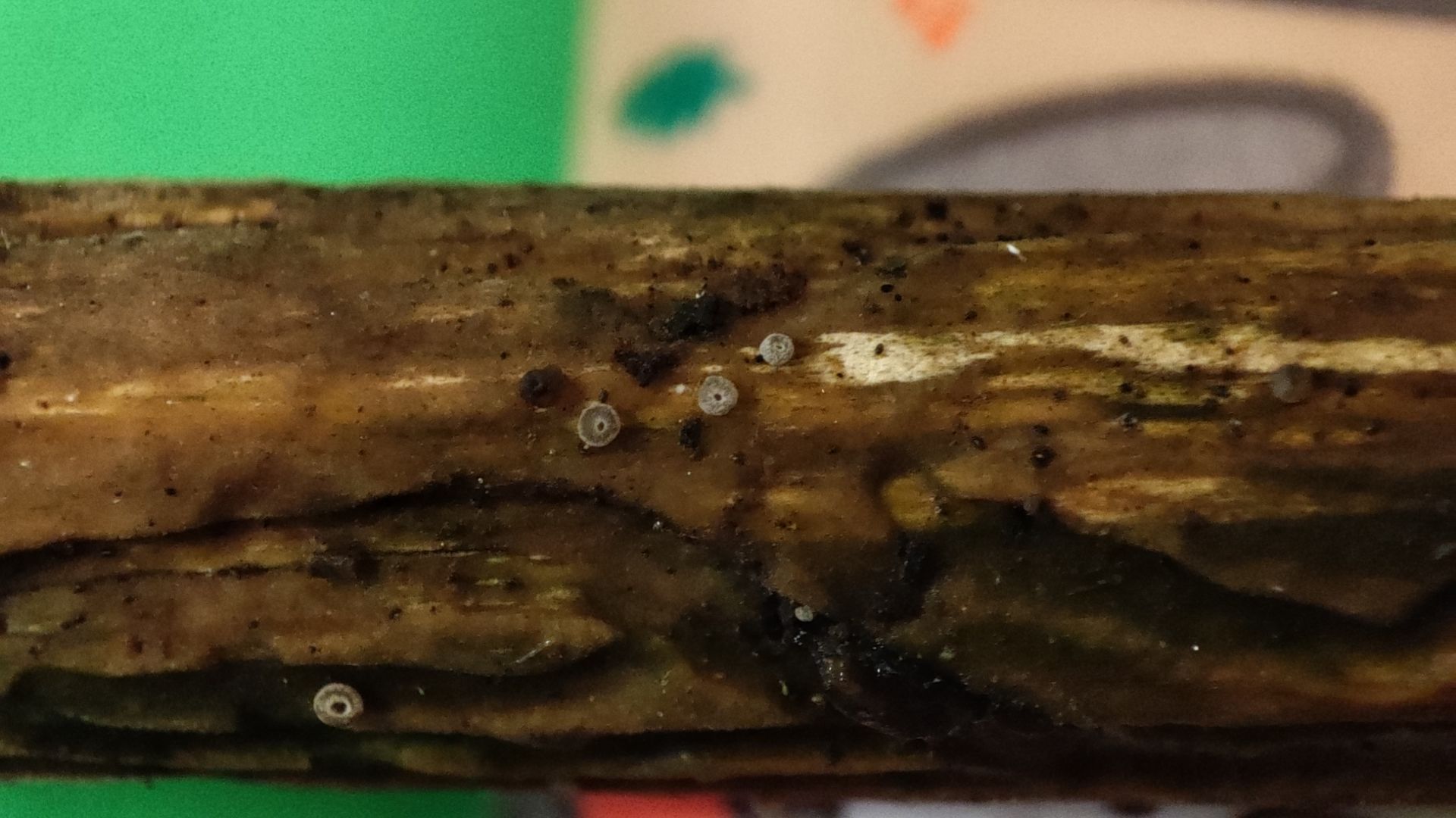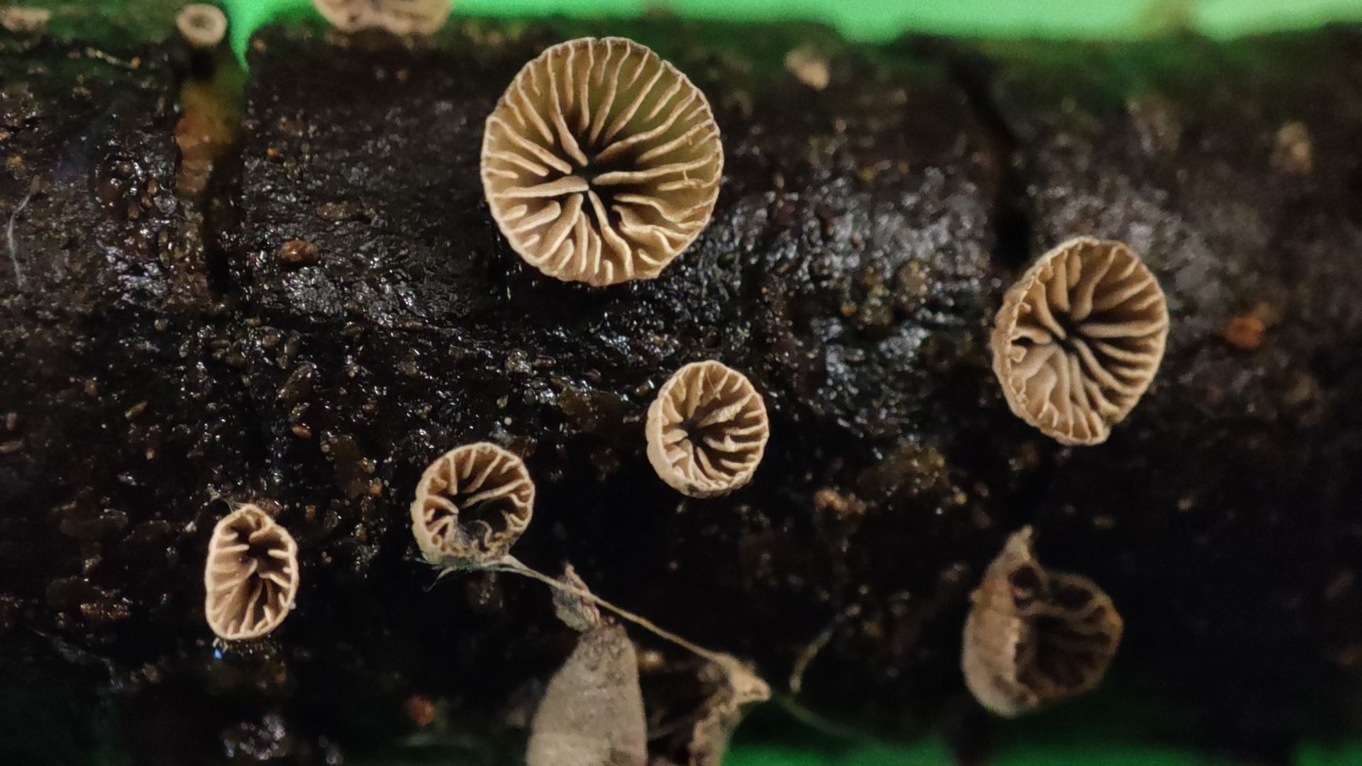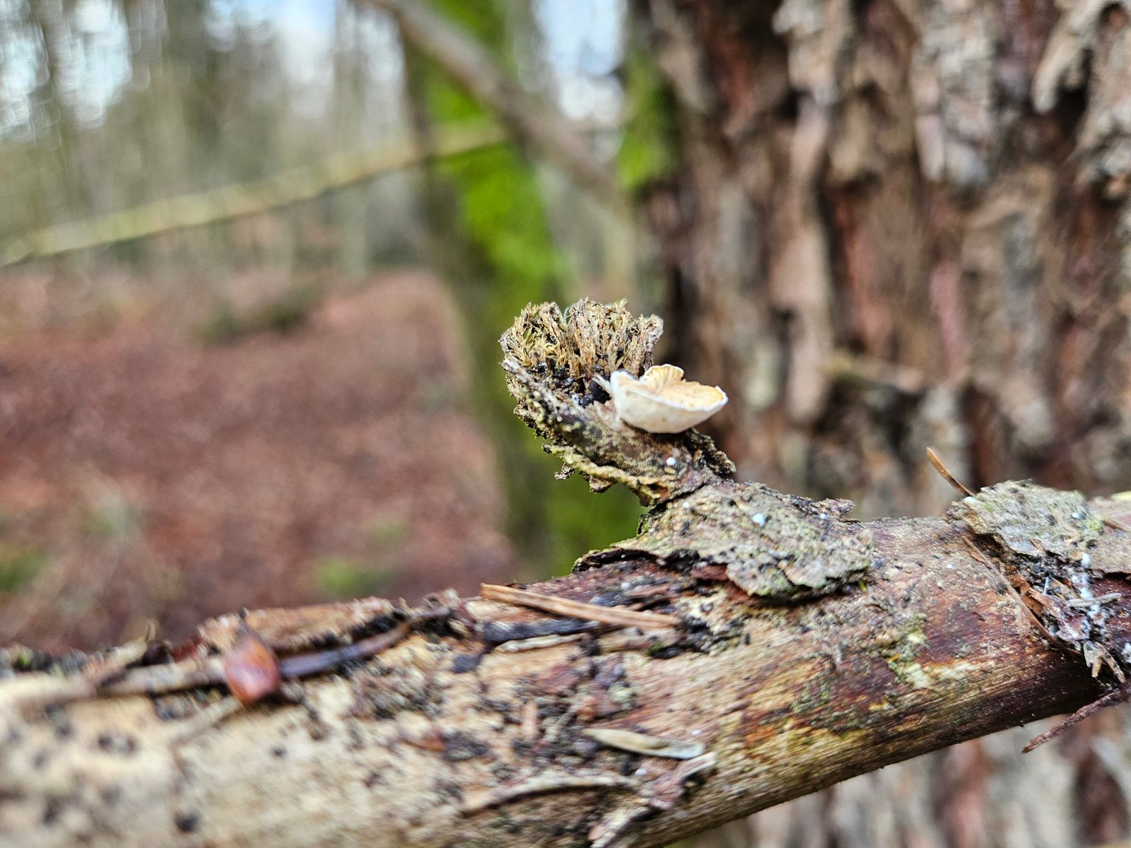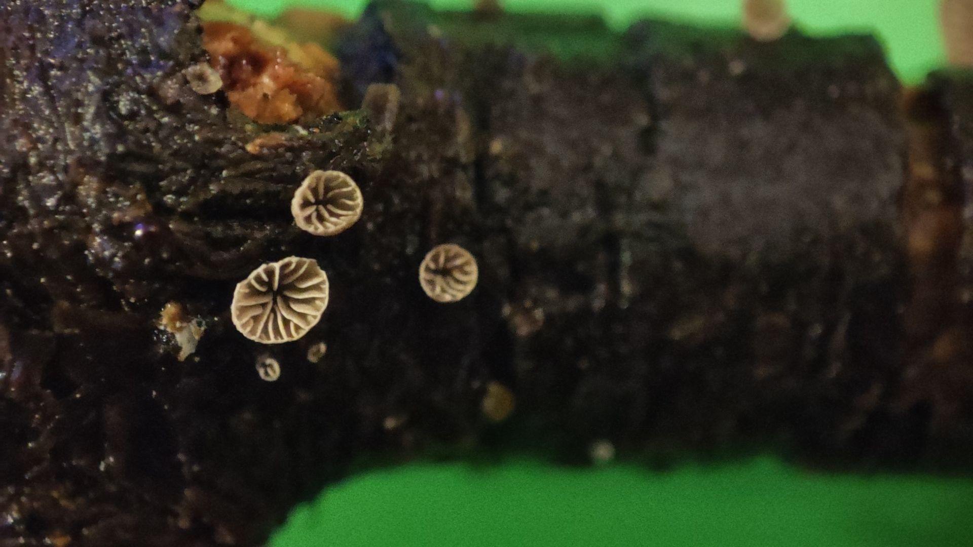 Aber mein "Pilzauge" hatte es rechtzeitig erspäht und ich holte es aus dem Haufen. Ich wurde nicht enttäuscht: Das Ästchen sitzt voller winziger schüsselförmiger Lamellenpilzchen, und mehr Fruchtkörperchen wollen noch sprießen!
