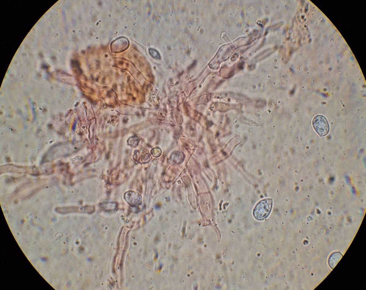 Stachel in KR, die Sporen sind rechtvariabel in Form und Größe, so 8-13*6-9 µm, Q ~1,1-1,8, Basidien meistens septiert, ohne Schnallen, sonstige Hyphen nicht selten mit Schnallen