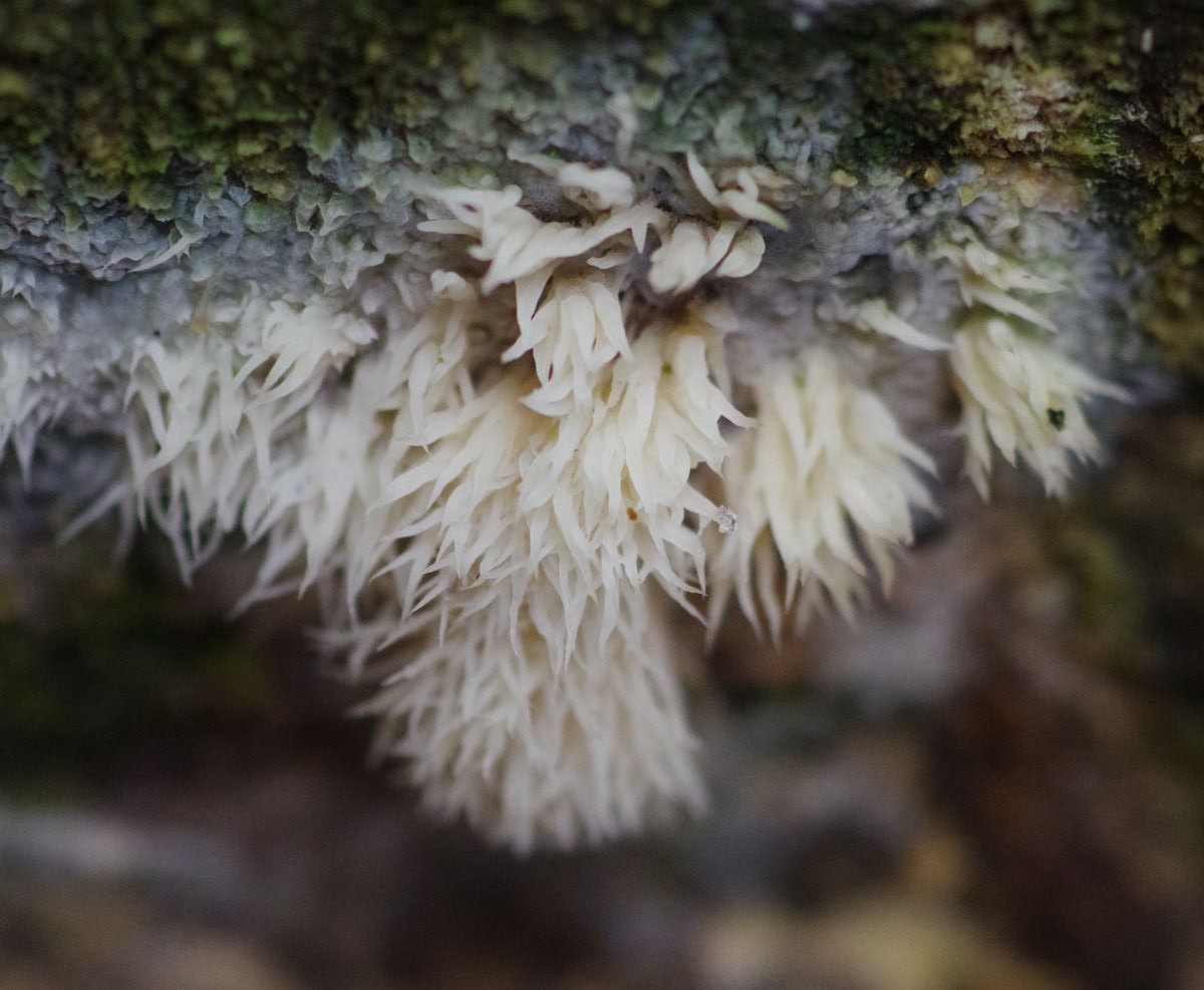 auf dem Stuben einer umgefallenen jungen Kiefer, die vor gut einem Jahr dem Brennholz zugeführt wurde, habe ich dieser Tage eine leicht bläulich graue Kruste und weiße Stacheln gefunden. Heute habe ich einen Beleg eingesammelt. Zunächst hielt ich das für zwei Arten, und hätte bei den Stacheln durchaus Mucronella bresadolae erwartet. Wobei diese Stacheln aber nicht hängen und doch ziemlich aus der Kruste zu wachsen scheinen, wohingegen Fencheltrameten etc. fehlen.