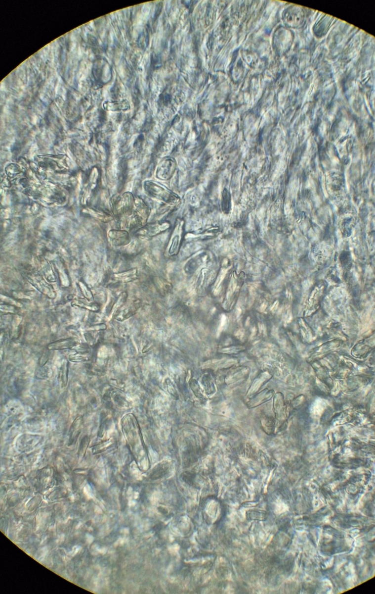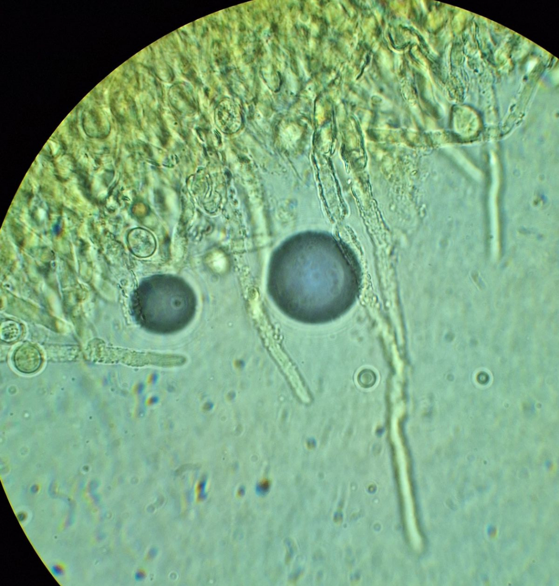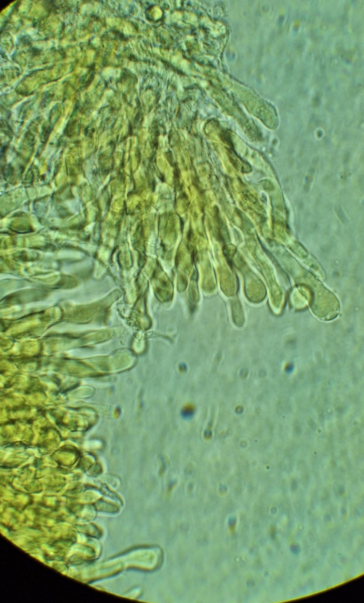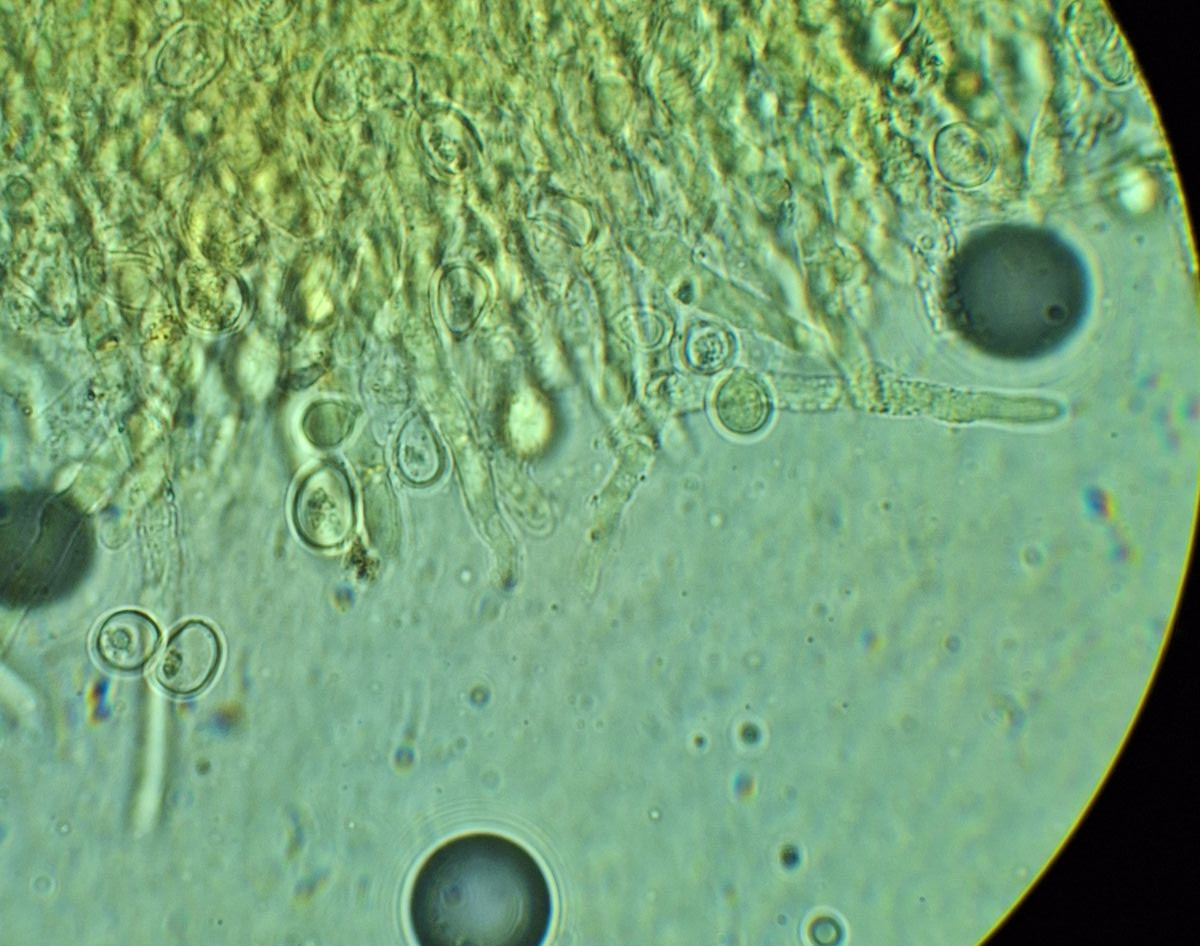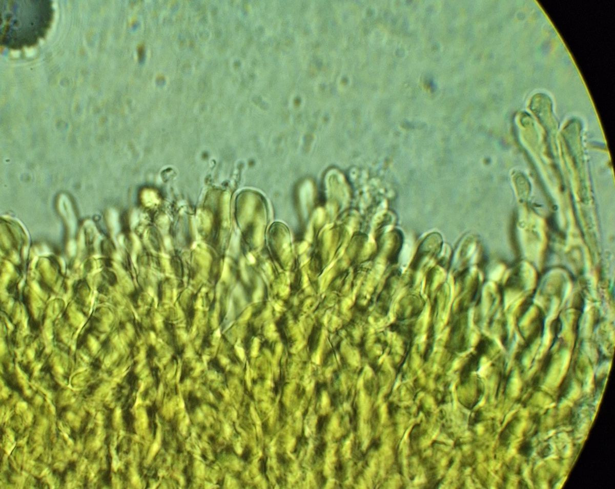 Stachel in KR, die Sporen sind rechtvariabel in Form und Größe, so 8-13*6-9 µm, Q ~1,1-1,8, Basidien meistens septiert, ohne Schnallen, sonstige Hyphen nicht selten mit Schnallen