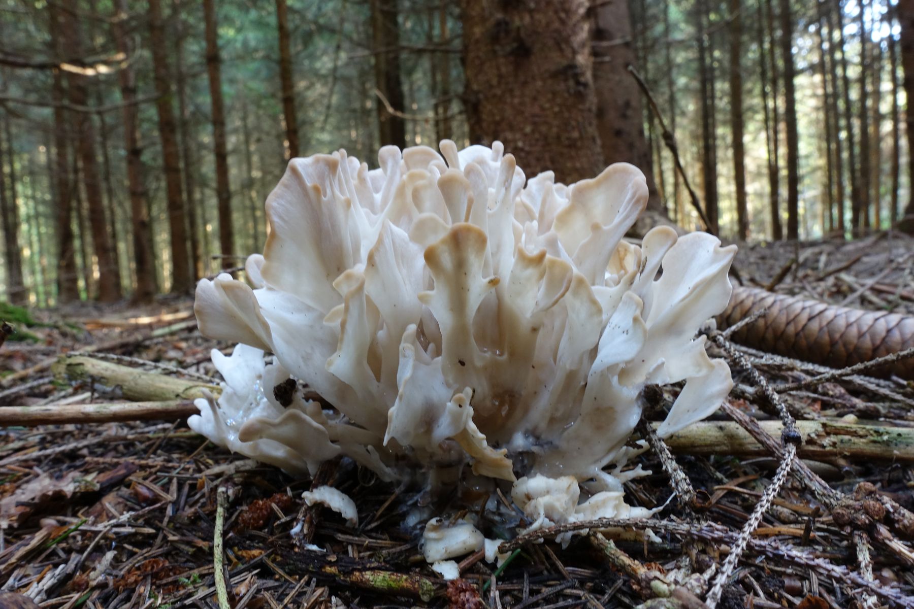 Bei uns in der Gegend ist das die erste Glucke die ich überhaupt bisher finden konnte, der Wald ist ein Fichten dominierter Mischwald. Die Glucke wuchs am Fuß einer großen Weißtanne. Dieses Jahr konnte ich sie dort nicht wieder finden, ob sie nicht gewachsen ist oder abgesammelt wurde, kann ich nicht sagen. Ich hatte sie damals stehen lassen und sie ist dort auch vergangen, das konnte ich beobachten. Leider habe ich nur dieses eine Foto.