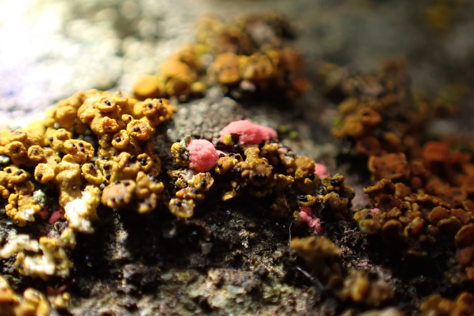 Was ist das pinkfarbene Etwas auf der Flechte?