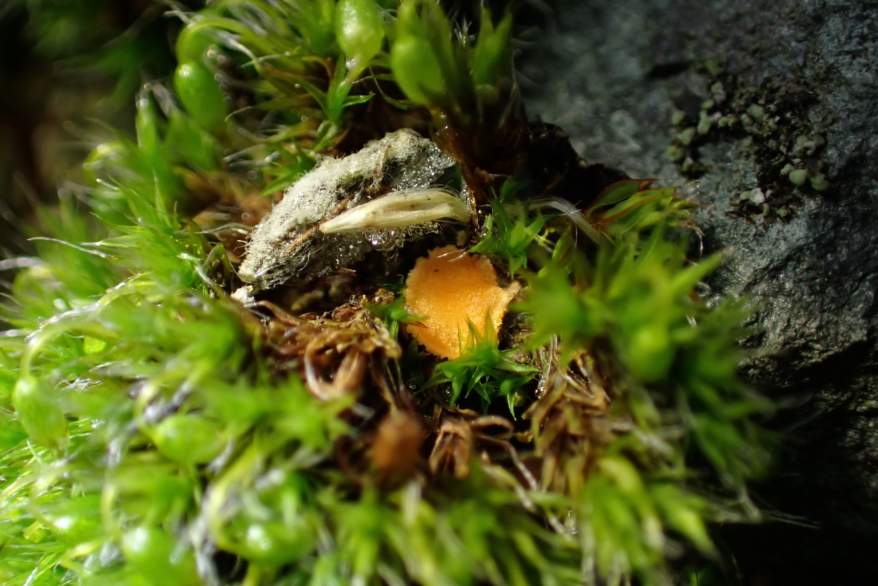 Moosbecherchen, hier Octospora musci-muralis, mit dem Wirts-Moos Grimmia pulvinata (Polster-Kissenmoos).