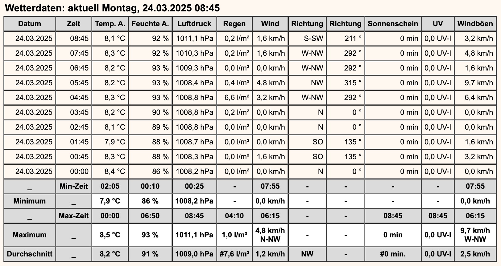 Zum Abschluss des Monats März gab es hier die ersten 10 Liter seit 8 Wochen. Und damit es mit der Feuchtigkeit nicht Überhand nimmt, werden die nächsten 14 Tage wieder schön trocken. ![]()