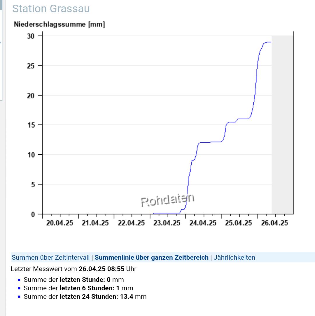 Jahresniederschlag bisher ca. 90 Liter (davon ca. 70 in den ersten 5 Wochen), zum selben Zeitpunkt 2024 x3. Und dann kamen ca. 200 Liter bis Ende Juni on top.