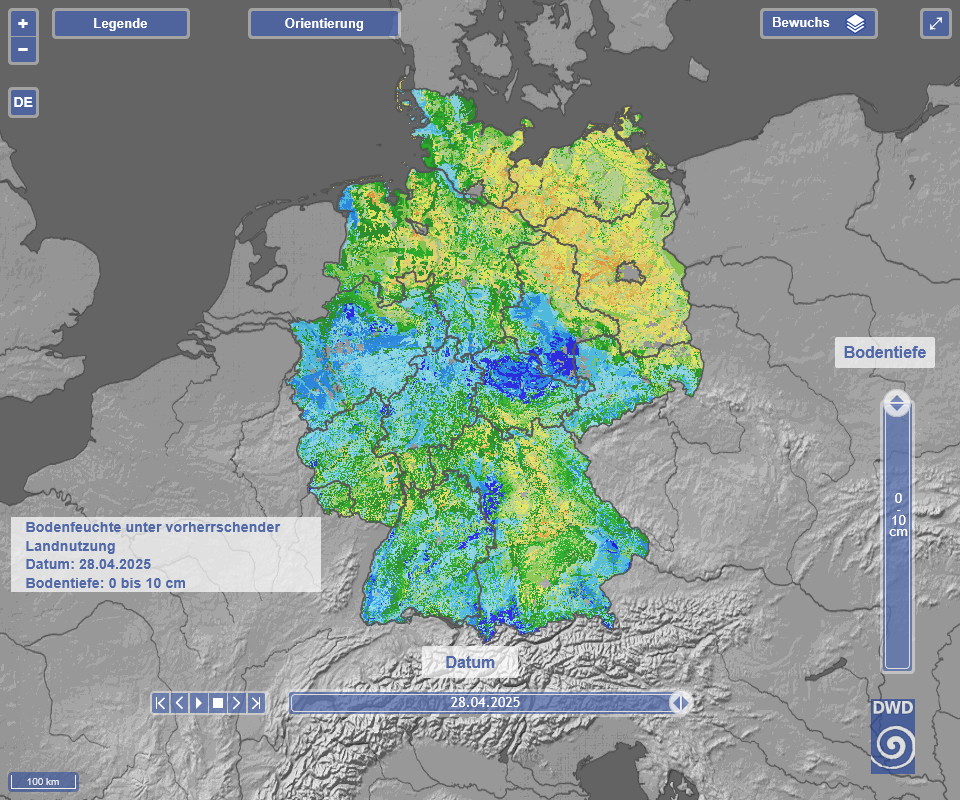 • Hier ist auch nichts großartig in Sichtweite. Es ähnelt aber, was die aktuelle Feuchte betrifft dem letzten Jahr. Etwas weniger, aber ähnlich. Da wurde es bis Mitte Mai sehr trocken, dann kam um den 20.05. der Regen.