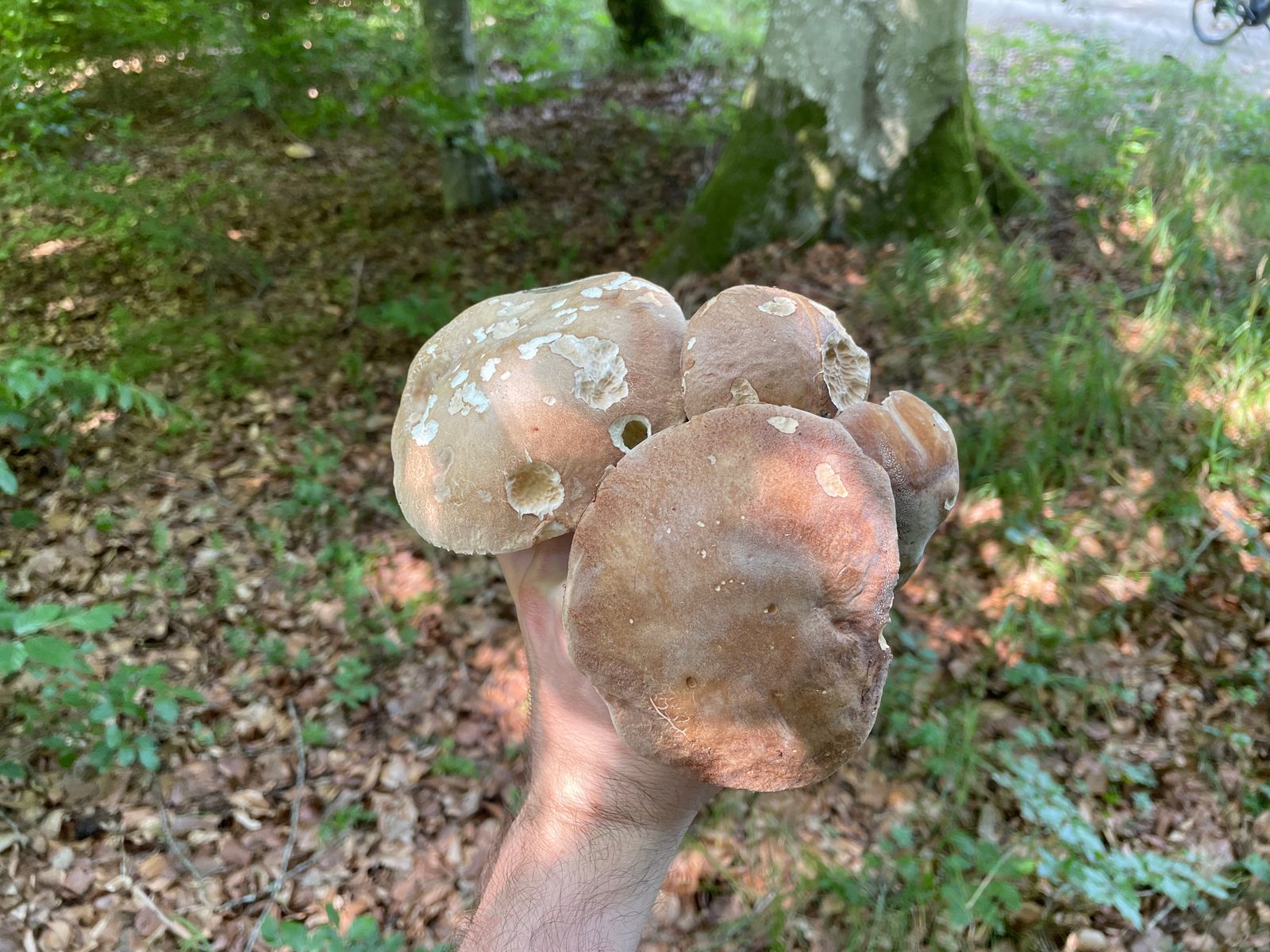 Ich war heute morgen wieder mit dem Nachbarn in aller früh unterwegs, um der Tageshitze zuvorzukommen. Trotz Tagestemperaturen um 30°C ist es im Wald noch erstaunlich feucht. Vielleicht noch zu feucht, im Hauswald ließen sich die Sommersteinpilze weiterhin nicht blicken, obwohl wir einen schönen Streifen mit Buchen und Eichen entdeckt haben. Die Flockenhexen und Perlpilze schieben aber weiter kräftig nach, es ist also nicht so, als wäre der Wachstumsschub vorbei.