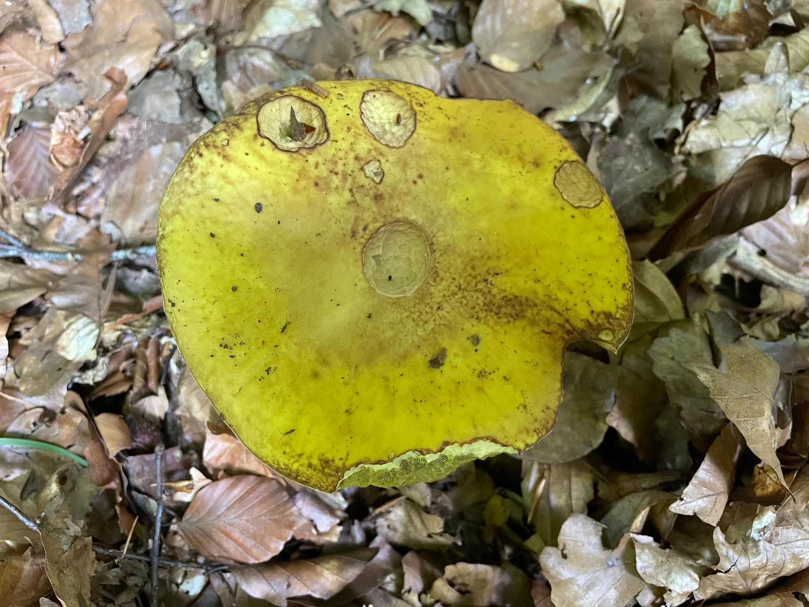 Und dann noch etwas bei dem ihr mir helfen müsst: Was zum Teufel habe ich hier gefunden? Sieht aus wie ein Steinpilz, ist aber knallgelb an Hut und Stiel. Die Farben sind NICHT verfälscht, sondern tatsächlich so intensiv. Es ist auch kein Befall, denn in dem Habitat standen einige von diesen Exemplaren mit identischer Färbung herum, auch jüngere Kandidaten. Stielnetz ist wie beim Sommersteinpilz unten etwas dunkler, nach oben hin heller bis weißlich werdend, Fleisch nicht blauend, Röhren gelblich-grünlich. Geruch unauffällig, Steinpilz-artig.