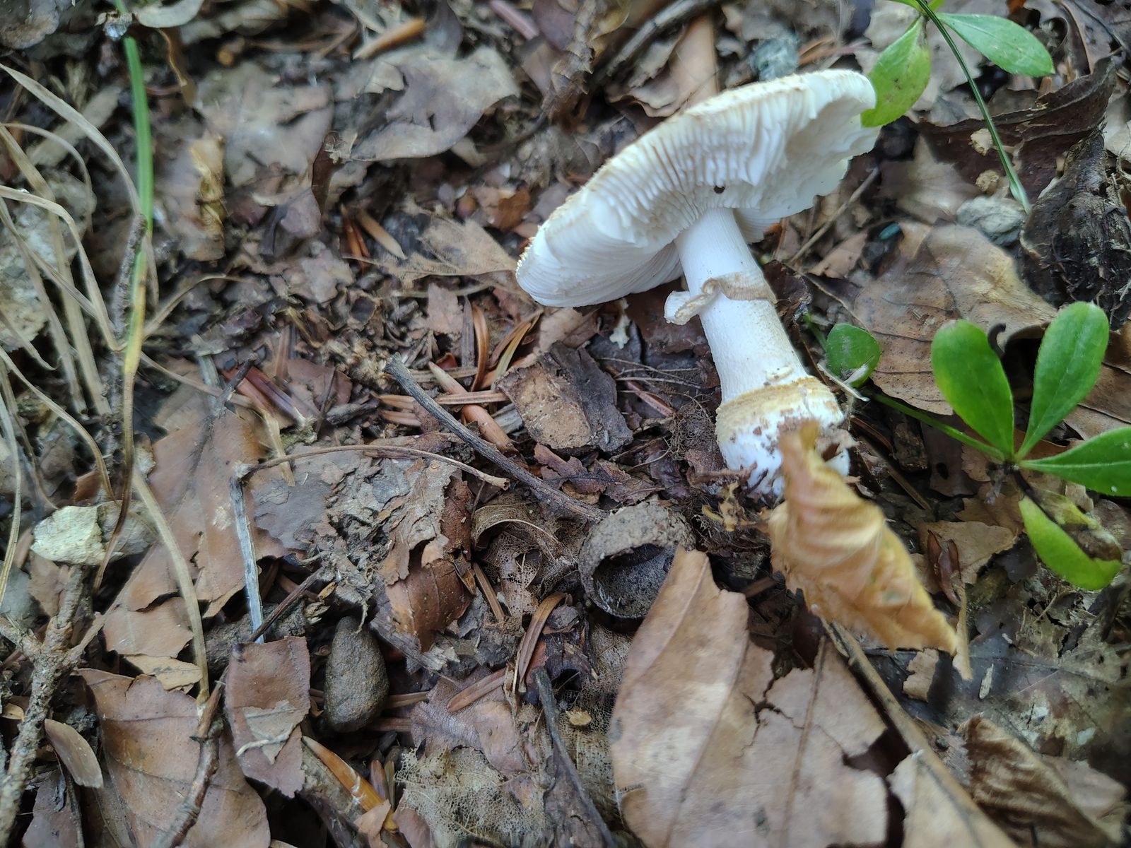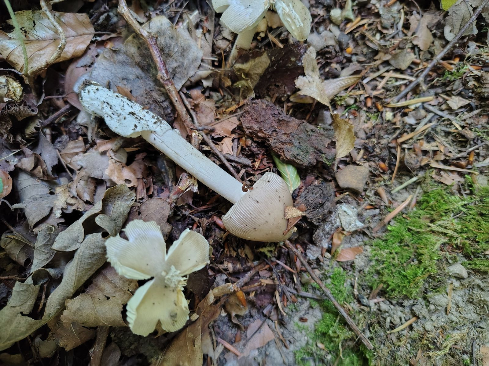 An mehreren Stellen tauchte dieser winzige graue Scheidenstreifling auf, Hüte kaum 4 cm erreichend. Immer in naher Nähe zu Hasel, vielleicht tatsächlich Amanita coryli oder ähnlich