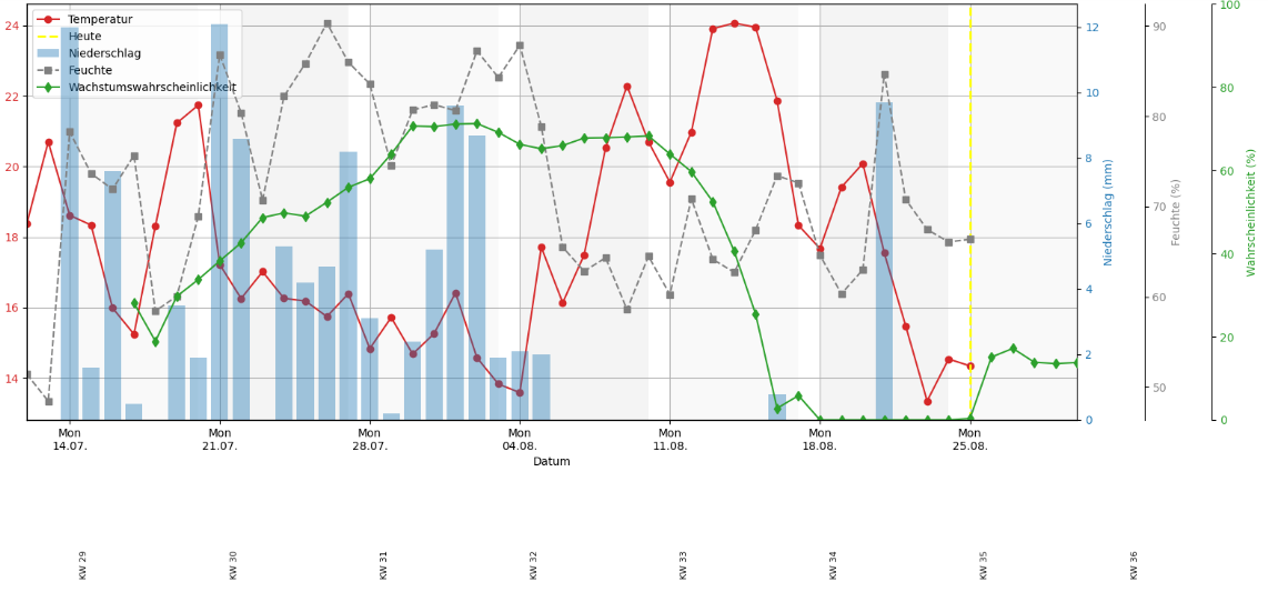 nicht ganz das selbe. Es gibt da schon ein paar Unterschiede. Was du aktuell siehst ist zwar die korrekte Berechnung bis zum heutigen Tag, allerdings sind die nächsten Tage nach der gelben (zugegeben, sieht man nicht gut!) "Heute" Linie nicht mit Daten der Wettervorhersage (für Morgen, Übermorgen etc) berchnet, sondern sind einfach der Trend, der sich aus den letzten paar Tagen ergibt. Die jetzige blaue Fläche rechts ist schon mit der Wettervorhersage der kommenden 10 Tage berechnet, also deutlich weiter und näher an der Wahrscheinlichkeit. Dazu werde ich jetzt noch 5 Tag Trend bauen. Also insgesamt 15 Tage, wovon 10 Tage schon mit der aktuellen Wettervorhersage des DWD berechnet sind.