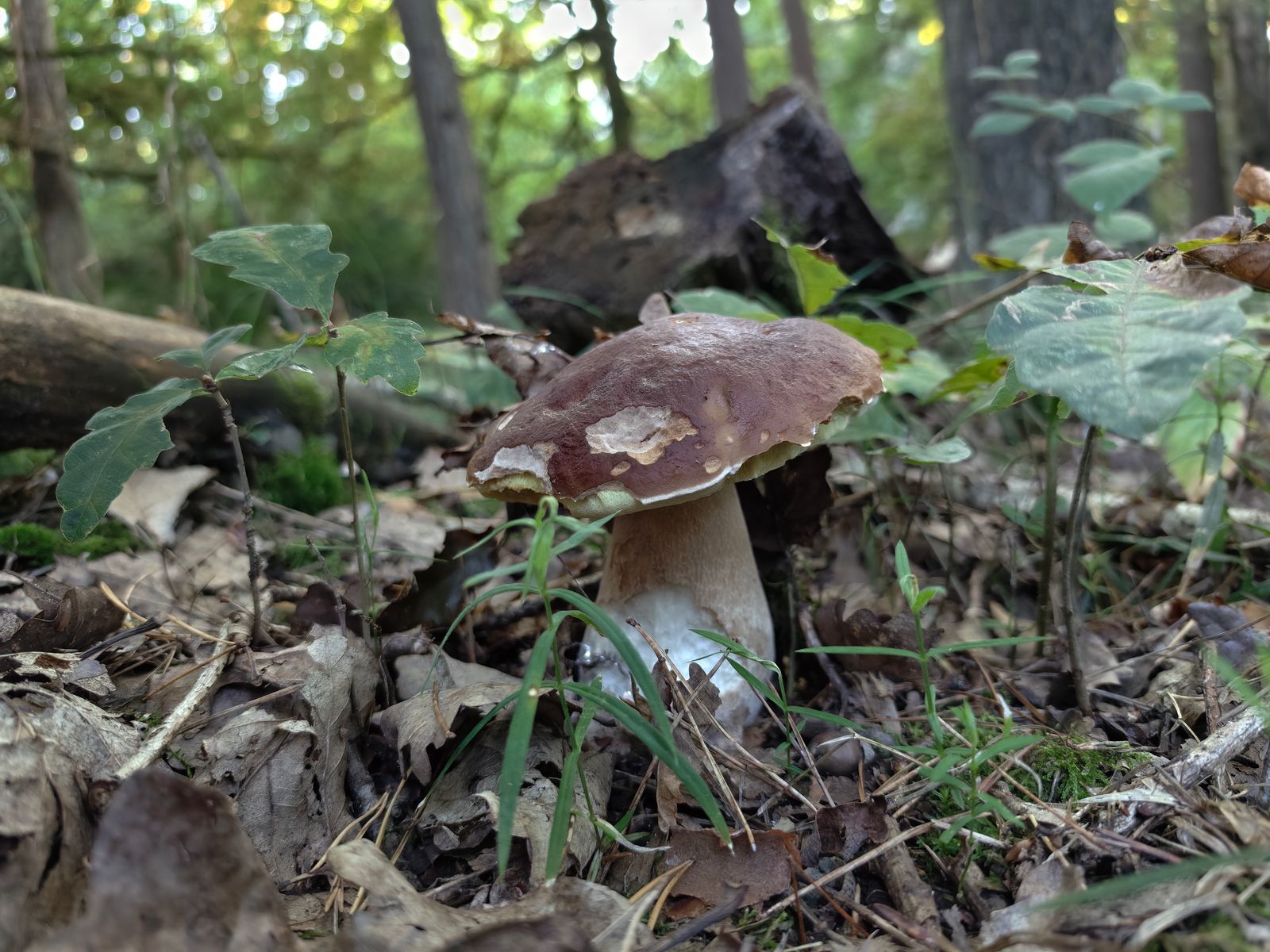 Die gute Stelle war bei einem kleinen Kiefernwäldchen mit eingestreuten Eichen. Bei den guten Fichten Spots schauen erst sehr vereinzelt Hutspitzen aus der Streu.