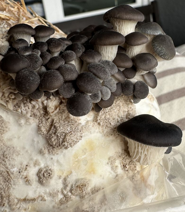 Dafür entwickeln sich die Taubenblauen Austern (Pleurotus ostreatus var. columbinus) ganz prächtig. Sie stehen auf dem Balkon und haben es schön kühl. Dadurch wachsen sie langsam, aber haben eine echt tolle Farbe.