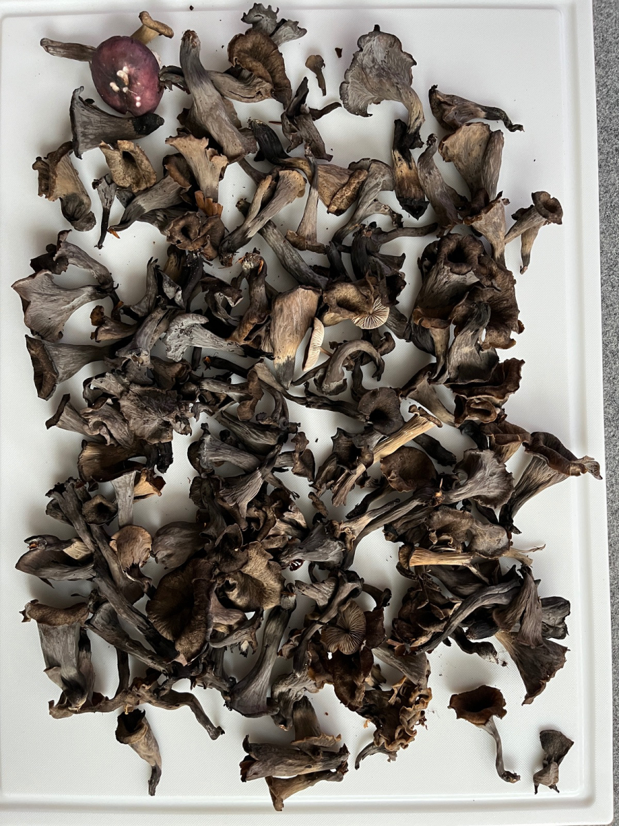 eigentlich wollte ich heute meine ersten Trompetenpfifferlinge entdecken, doch die besagte Stelle konnte ich nicht finden. Also raus aus dem sauren Mischwald und rein in den unbekannten Waldmeister- Kalk- Buchenwald. Moment mal, die Stellen sehen genauso aus, wie meine Totentrompeten Spots. Eine halbe Stunde später hatte ich einen neuen Spot gefunden, nach einer Stunde den zweiten. Statt Trompetenpfifferlinge gab es „nur“ Herbsttrompeten.